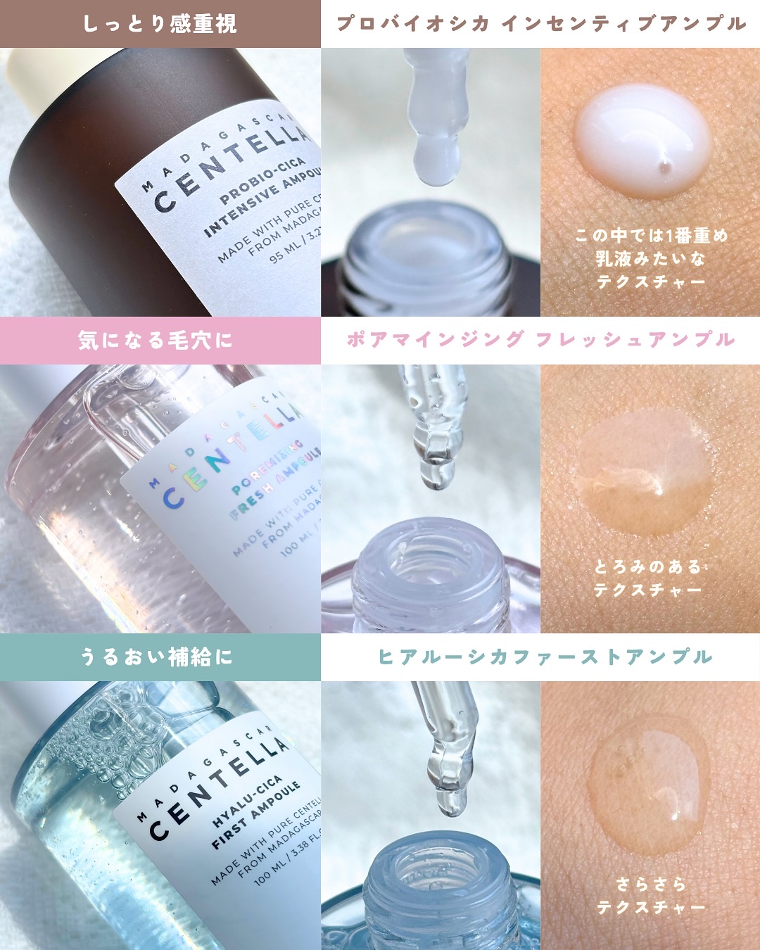 大人気ブランド♡SKIN1004アンプル6種比較してみました٩(๑❛ᴗ❛๑)۶🧡センテラアンプル🩵ヒアルーシカファーストアンプル🤎プロバイオシカインテンシブアンプル🤍トーンブライトニングカプセルアンプル💚ティーツリカリリーフアンプル🩷ポアマイ...