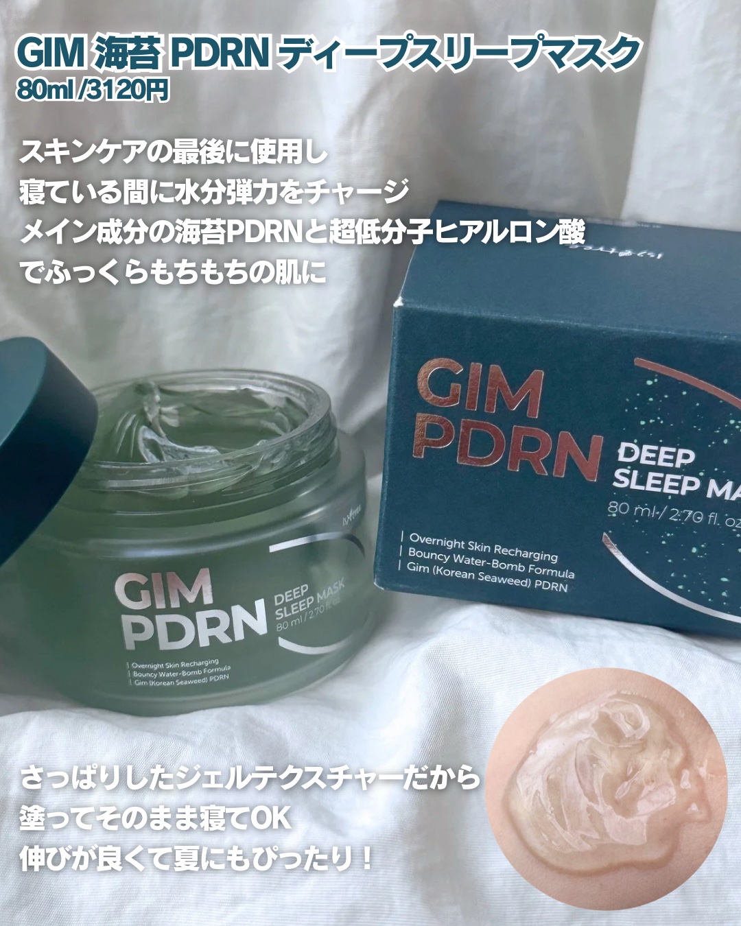 \寝ている間にもっちり肌に💚/▼イズエンツリー▼GIM海苔PDRNディープスリープマスク 80ml¥2,780(参考価格)海苔由来のPDRNジェルクリーム💚軽めの塗り心地!少しベタつきは感じるけど塗って寝るともっちり肌に!重い感じはないよ!す...