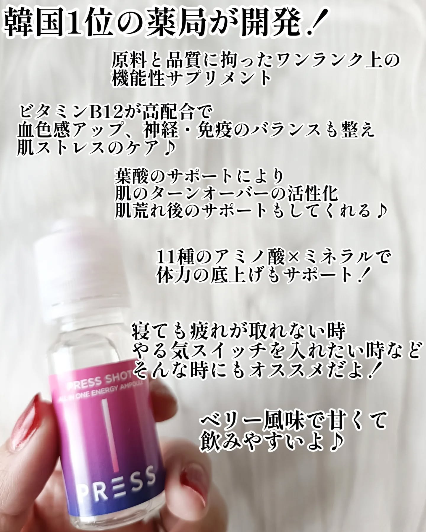 #PR#pressshot@pressshot_japan_official押して、振って、水なしで飲める!健康と美肌✨️Wでケア!PRESSSHOT💖血液づくりに必要なビタミンB12が高濃度配合。葉酸(ビタミンB9)がエイジングケア*をサポ...