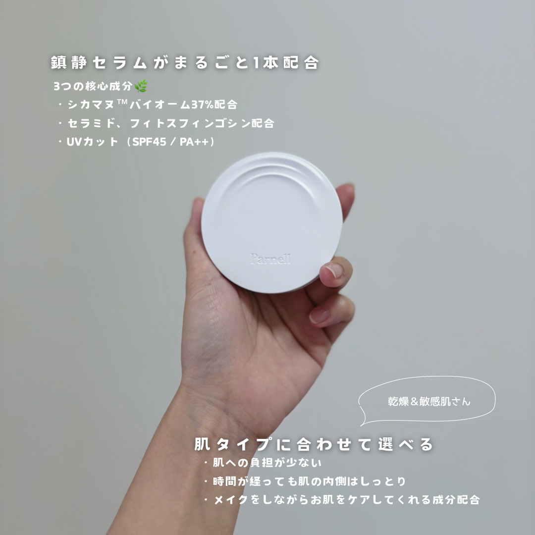 - ・整肌成分を配合したParnellの92セラムを一瓶詰め込んだシカマヌセラムクッション ・シカマヌセラムクッションは3つの美容保湿成分が配合 ・シカマヌバイオーム37%(保湿成分) ・セラマイドフィトスフィンゴシン(保湿成分) ・紫外線遮断機能性SPF45、PA++ ・セラム成分がたっぷり配合され、お肌に優しい使い心地で敏感なお肌をナチュラルにカバー