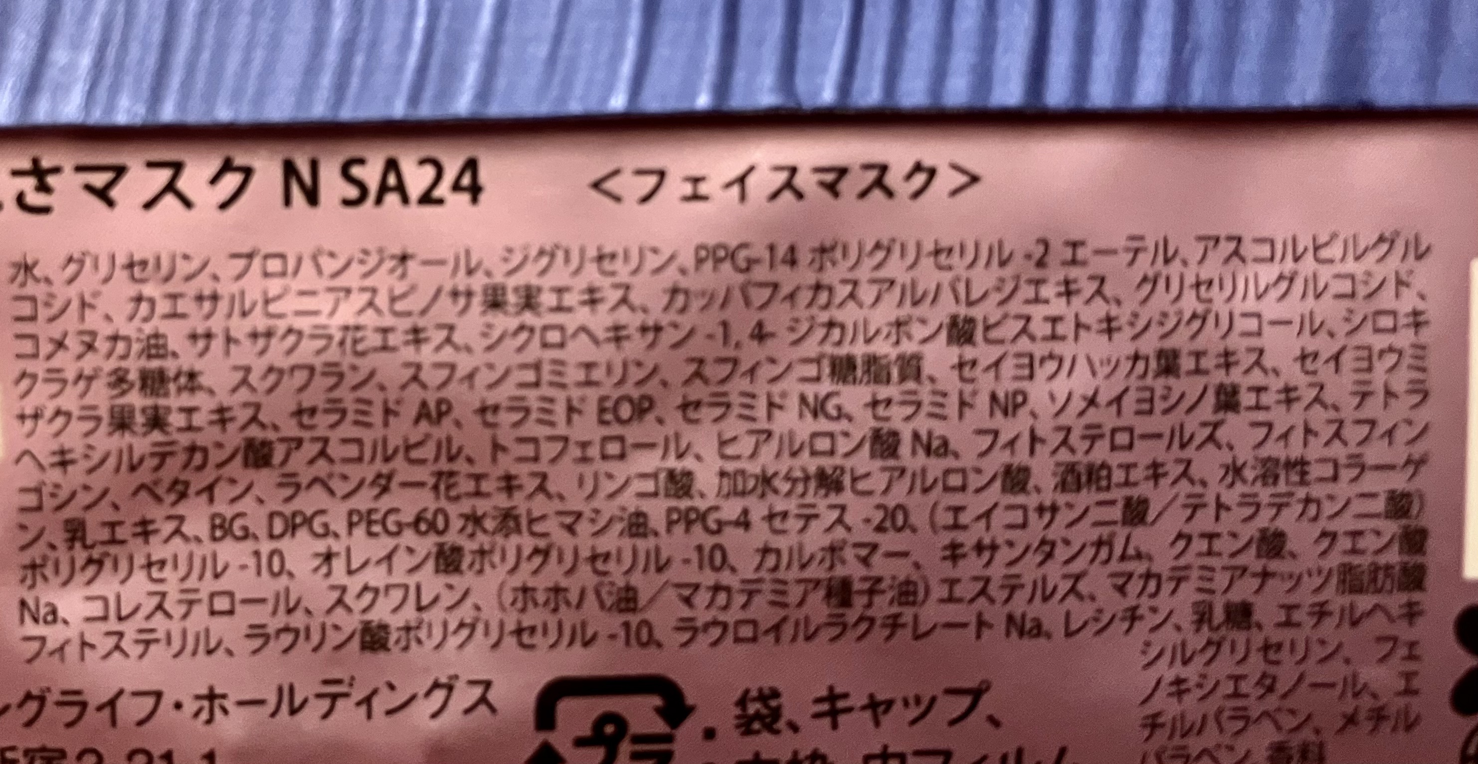 - <30枚入り> 水、グリセリン、プロパンジオール、ジグリセリン、PPG-14ポリグリセリル-2エーテル、アスコルビルグルコシド、カエサルピニアスピノサ果実エキス、カッパフィカスアルバレジエキス、グリセリルグルコシド、コメヌカ油、サトザクラ花エキス、シクロヘキサン-1,4-ジカルボン酸ビスエトキシジグリコール、シロキクラゲ多糖体、スクワラン、スフィンゴミエリン、スフィンゴ糖脂質、セイヨウハッカ葉エキス、セイヨウミザクラ果実エキス、セラミドAP、セラミドEOP、セラミドNG、セラミドNP、ソメイヨシノ葉エキス、テトラヘキシルデカン酸アスコルビル、トコフェロール、ヒアルロン酸Na、フィトステロールズ、フィトスフィンゴシン、ベタイン、ラベンダー花エキス、リンゴ酸、加水分解ヒアルロン酸、酒粕エキス、水溶性コラーゲン、乳エキス、BG、DPG、PEG-60水添ヒマシ油、PPG-4セテス-20、(エイコサン二酸/テトラデカン二酸)ポリグリセリル-10、オレイン酸ポリグリセリル-10、カルボマー、キサンタンガム、クエン酸、クエン酸Na、コレステロール、スクワレン、(ホホバ油/マカデミア種子油)エステルズ、マカデミアナッツ脂肪酸フィトステリル、ラウリン酸ポリグリセリル-10、ラウロイルラクチレートNa、レシチン、乳糖、エチルヘキシルグリセリン、フェノキシエタノール、エチルパラベン、メチルパラベン、香料