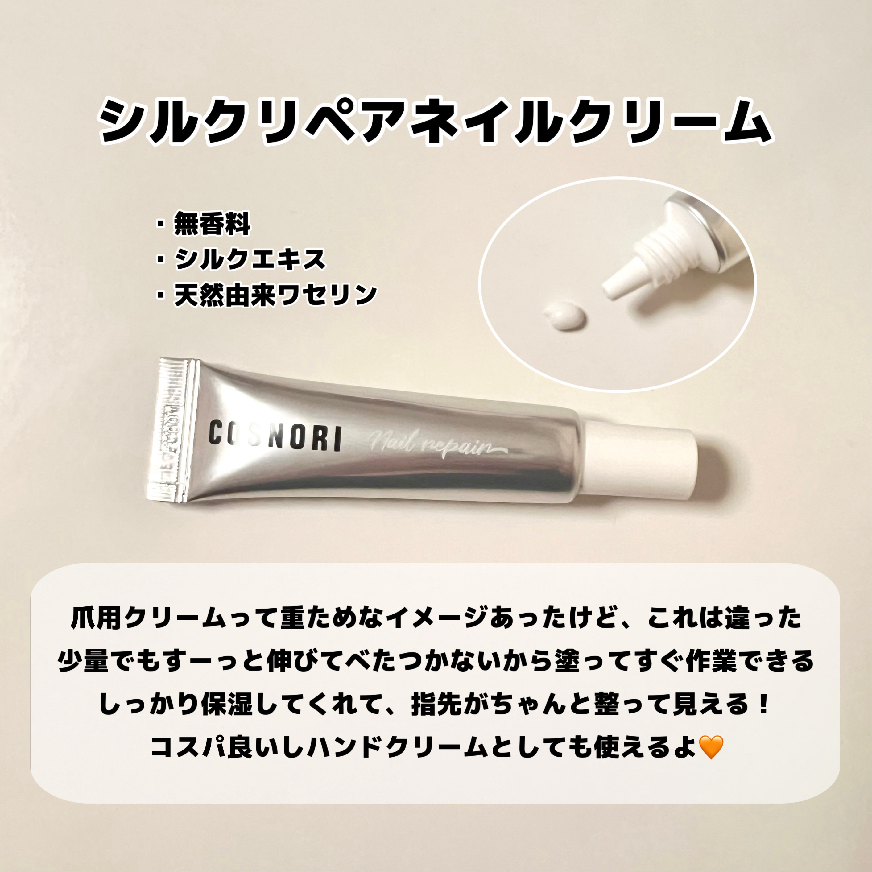 塗ってすぐスマホ触れるネイルクリーム💅✨一年中お世話になりっぱなしのキューティクルケアアイテム♡オイルをよく使ってたけどクリームの方が使いやすいかも?!と思わせてくれたのがCOSNORIのネイルクリーム🫧1番は質感がちょうど良く密着感...