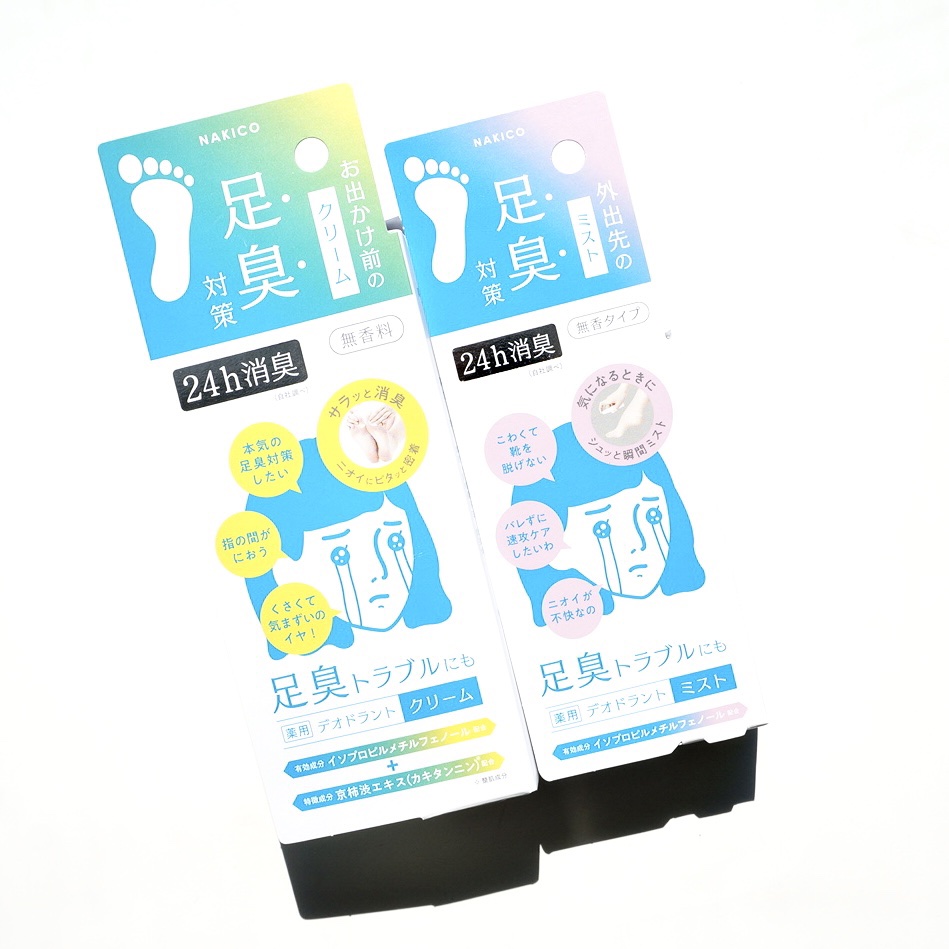 NAKICO冬の新作は24時間消臭!自社調べ 毎日使える足のニオイケアアイテム! 有効成分「イソプロピルメチルフェノール」でニオイの元を殺菌消臭。 家ではクリーム、外ではミストと使い分けできるのもいいですね。無香料なのも🙆