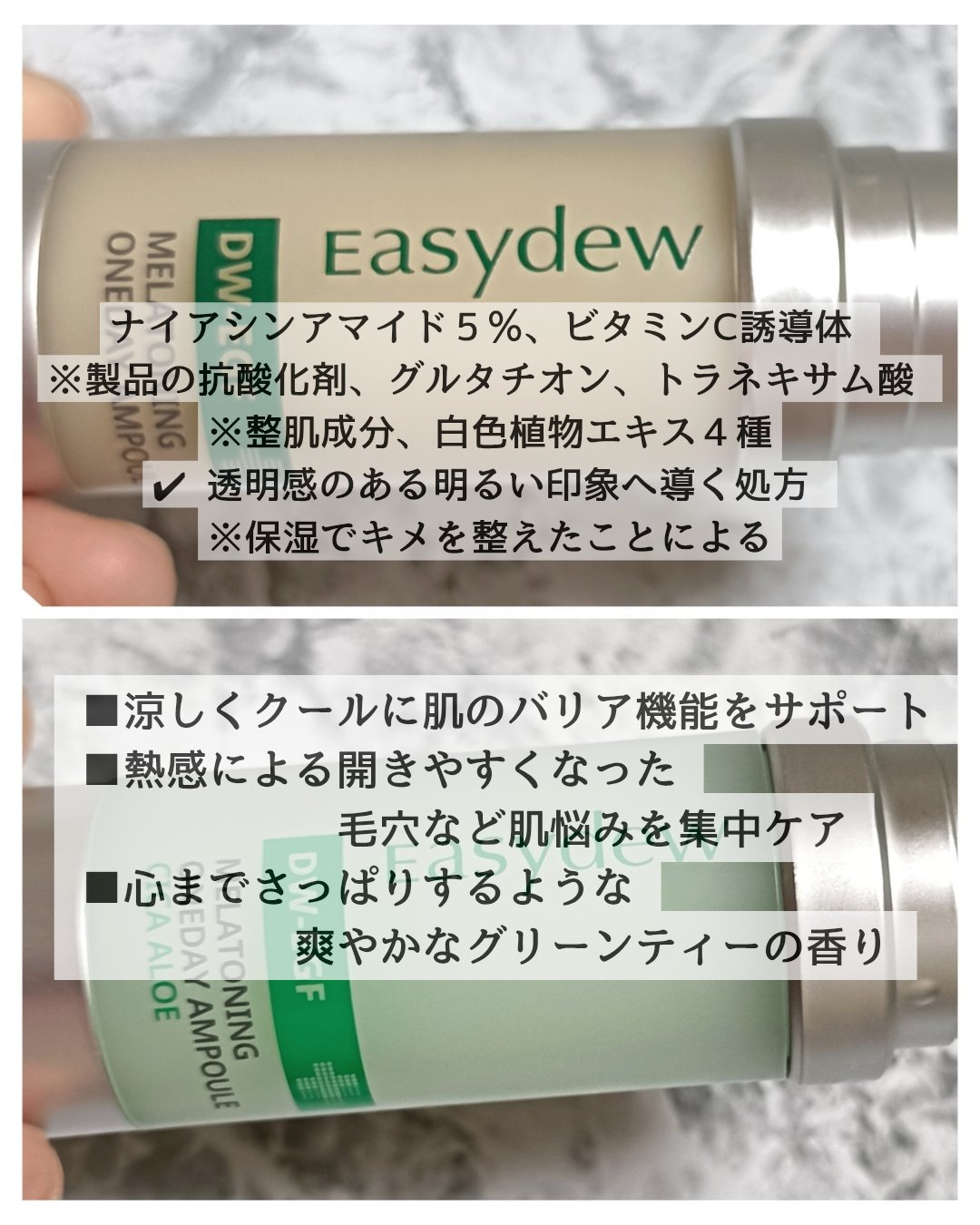 肌のクーリングができる夏のスキンケアアイテム🌿Easydew(イージーデュー)DW-EGFメラワンデーセラム3,878円(税込)15mLDW-EGFメラワンデーセラムシカアロエ3,878円(税込)15mL夏の必須スキンケアアイテム🌿保湿でキメ...