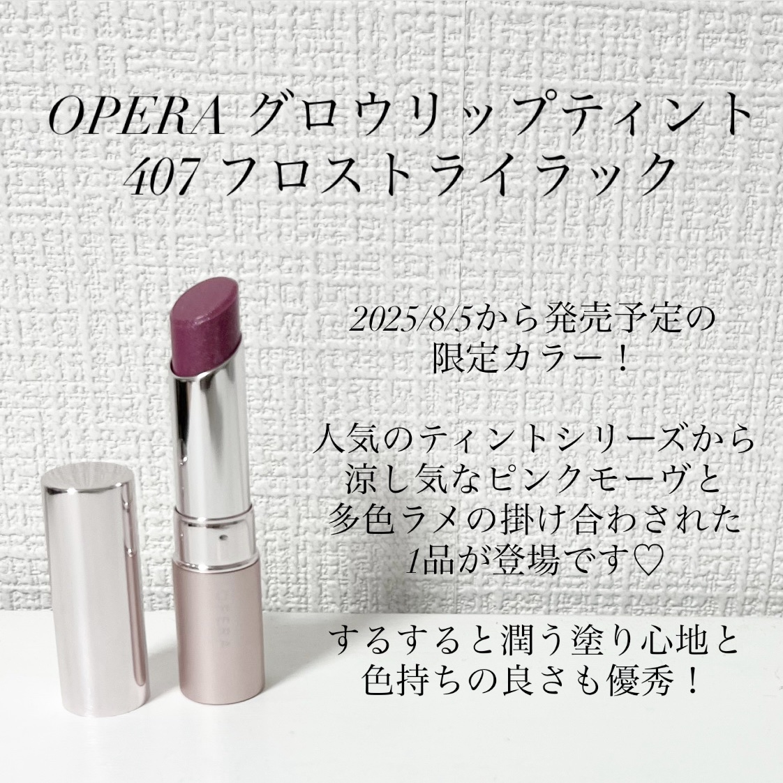 淡いけれど薄くはない、冬のキュートピンクリップという印象です。フロストライラックでほんのり白みとパープル感のあるピンクティント。発色が良くすごく可愛い色ですが大人っぽく甘さは控えめ。絶妙なカラーでこだわって調色してある感じがします。テクスチャ...