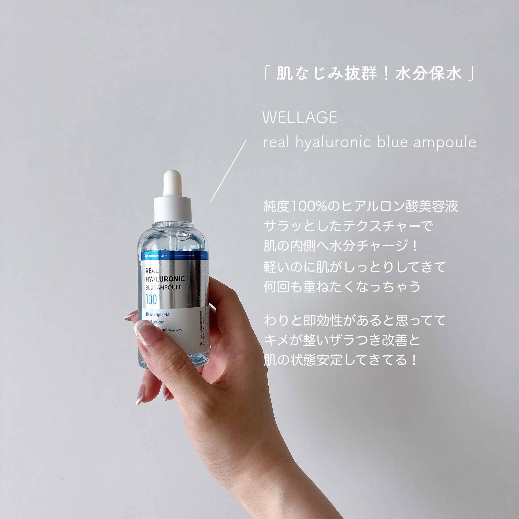 - 純度100%ヒアルロン酸で乾燥知らずの水光肌。 韓国の皮膚専門製薬会社から誕生したダーマコスメブランドWELLAGE! 純度100%のメディカルグレードのヒアルロン酸で透明感のある水光肌を手にでき、又、高分子~低分子の9重層のヒアルロン酸配合で成分を肌の隅々まで水分を到達してくれる美容液。 ダーマコスメ部門で2年連続受賞!韓国美容アプリで見ない日はないほど。 お肌の鎮静に効果的なシカ、パンテノール、ベータグルカンなどを多数配合!べたつかないのにしっかり保湿されます。 高分子~低分子の9重層のヒアルロン酸配合で、高保湿なのにも関わらず、 べたつかず、浸透率の良い美容液になります。 ブルーカラーは8つの自然由来成分カラーであり、敏感肌の方も安心してご利用頂けます。