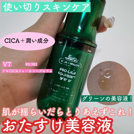 ⭐️⭐️⭐️⭐️☆すごく緑です💚VTプロシカフォーカシングセラムポンプ式の美容液キャップがちょっと開けにくい液は緑ジェルっぽいテクスチャー入浴剤の「森の香り」に似た匂いがしますちょっと強めするする伸びてしっとり✨つややかなお肌にクリームとセッ...