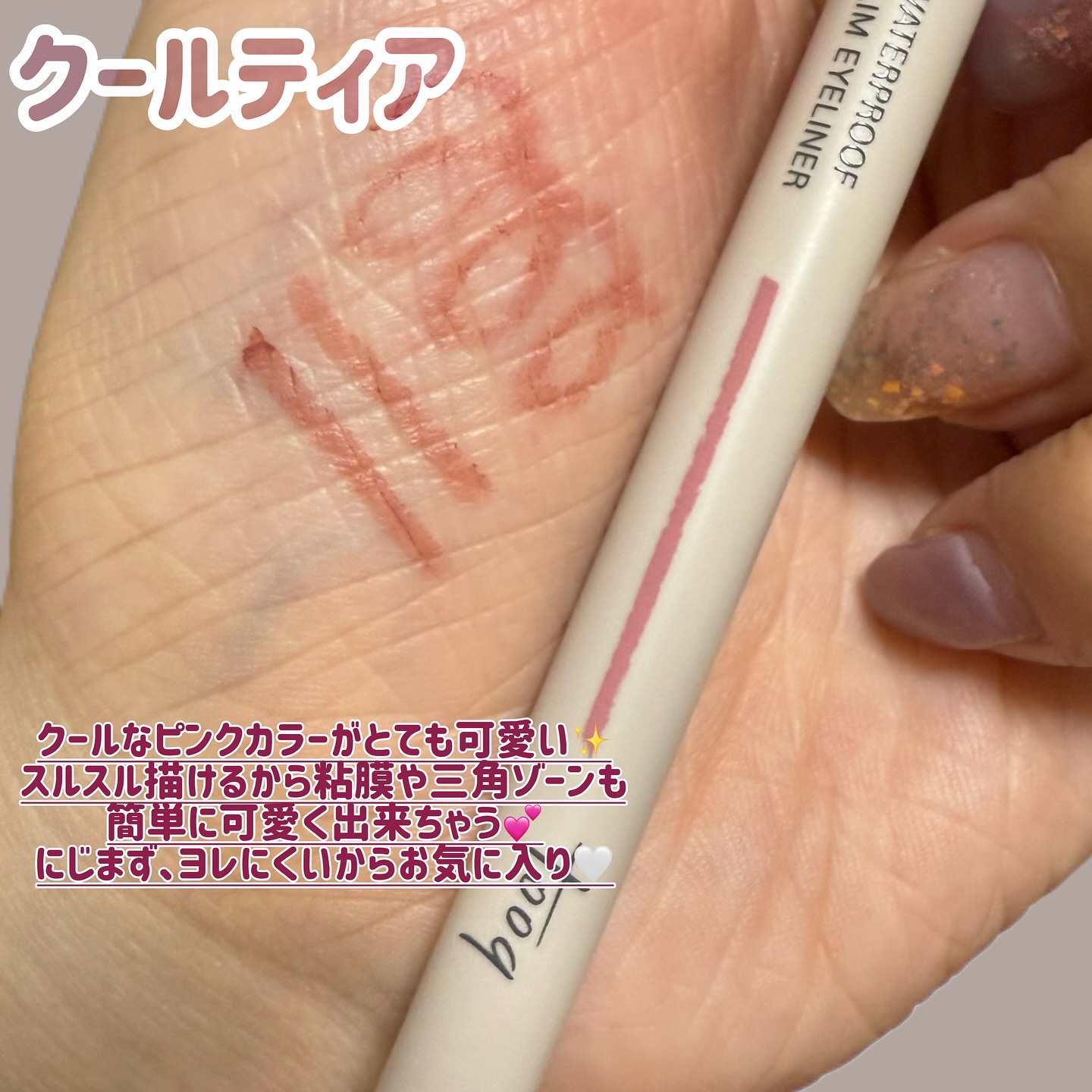 トゥークウォータープルーフスリムアイライナー・桃花サルモン・クールティア✼••┈┈••✼••┈┈••✼••┈┈••✼••┈┈••✼中顔面を短く見せる「涙袋メイク・下まぶたメイク」に最適な設計💡多彩なカラーバリエーションでパーソナルカラー対応で...