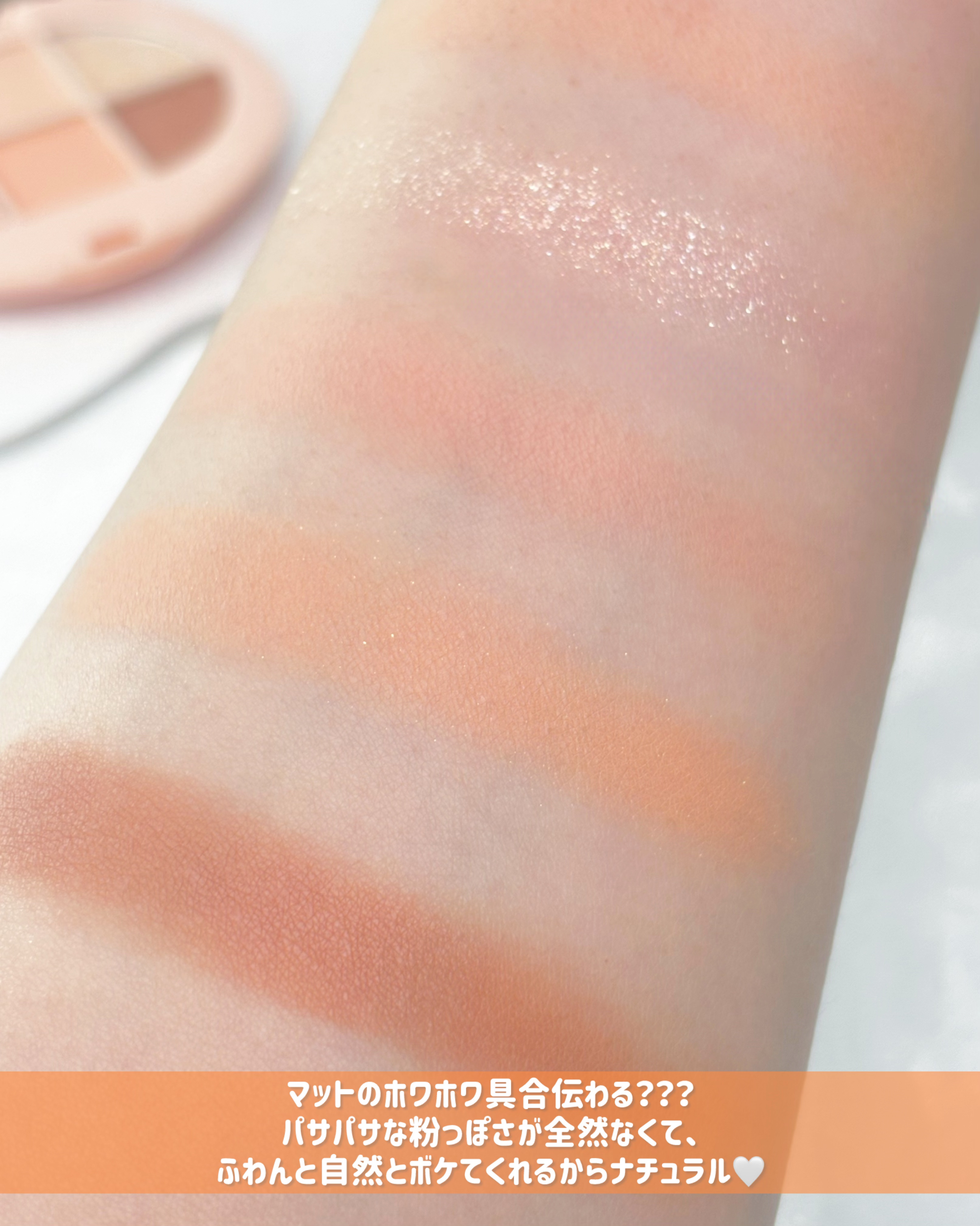 めっちゃくちゃ進化してるーーー😳😳😳 ブラシでも指でも取った瞬間の柔らかさが桁違いに良くなってる!!! ふわっとブレンドしやすくてボカしやすい!!! 05トフィーナッツラテはデイリー使いしやすい ナチュラル発色でかなり自然な仕上がり🥜 今っぽい色味で盛らずに陰影で盛る感じです💗 明度にしっかり差があって陰影をつけやすい◎ 06バニラティーラテはほろ苦ピンクメイクに🎀 05と比較するとかなり強い発色で スモーキーメイクに合いそうなパレット! パレット左から2番目のホワイトラメが ほんとに可愛くて透けるように光る感じ💎
