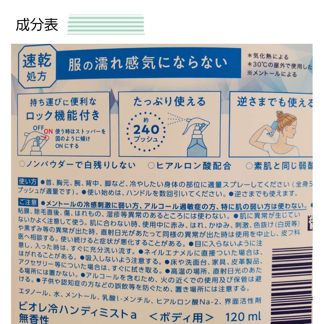 今年の夏は暑すぎて◆ビオレ◻︎冷ハンディミスト本体120ml◻︎無香性◻︎¥935※メントールのスースーした匂いあまりにも暑い日が続くので初めて冷感ミスト購入してみました☻ハンディサイズで使いやすい&持ち運びやすいです◎私は出かける前に首、背...