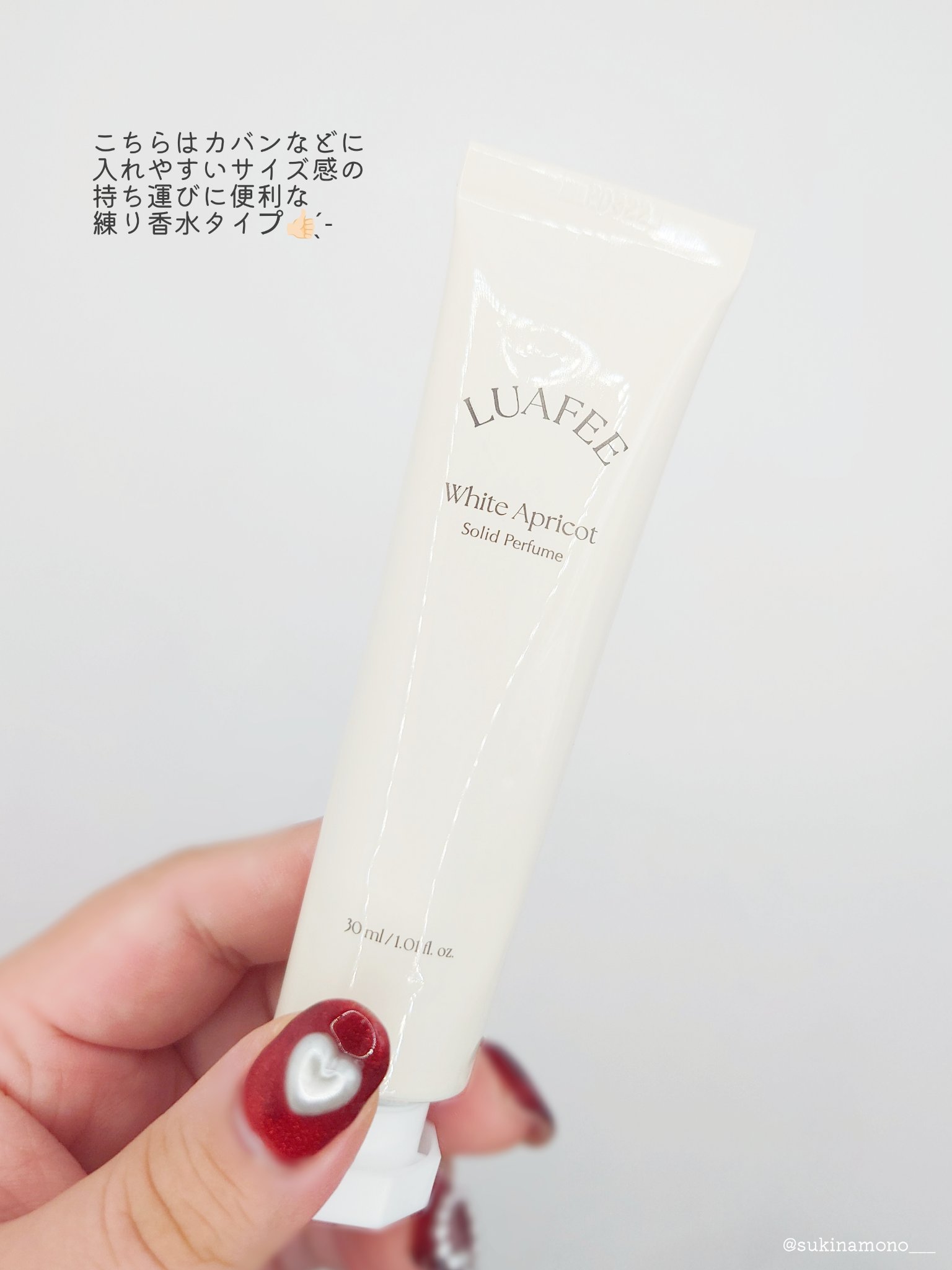 ルアペ ホワイトアプリコット オードパルファムは、トップからミドルの上品なフローラルの香りが目立つ印象🌸 ベースのバニラは媚びた甘みが無くて好みだった♡ムスクやアンバーがメインで大人っぽいの😍 ホワイトアプリコット ソリッドパフュームはトップにフレッシュな柑橘系がきていてレイヤードすると香りに深みが出て好きだったよ😍 控えめに香らせたい時は単体で使っても良さそう🙆♀️