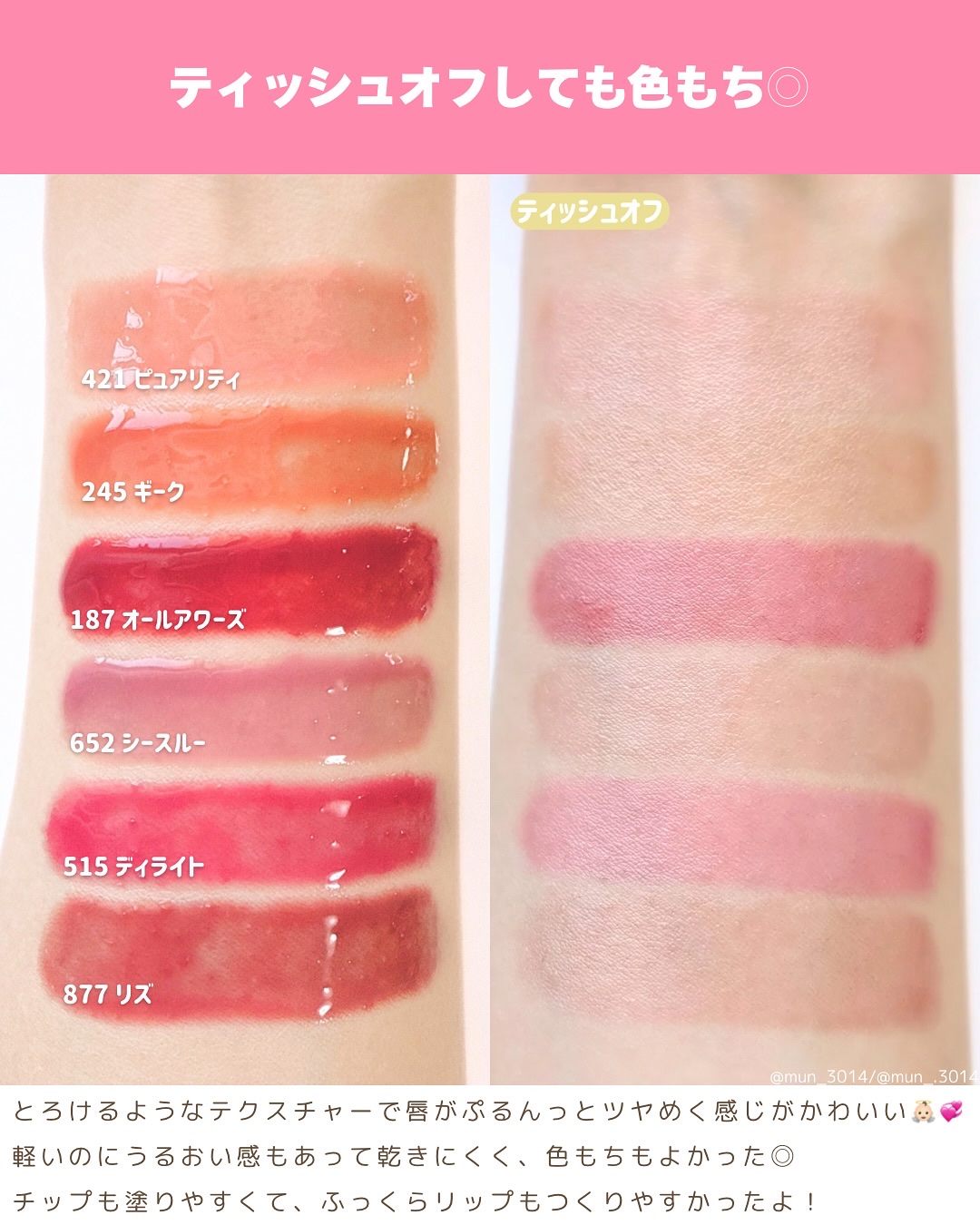 AMUSE様より1年分企画に当選しいただきましたˊ˗ ありがとうございます❤︎ 12時間色•ツヤ•保湿が透き通ってぷにゆっと満ち溢れるロングラスティング&密着フィットのジェルフィットティント🫧 やわらかいフォンデュに唇が包まれたような唇の角質•縦じわを抑えてもっちりぽってりな唇をつくるプランピング効果のメルティングカラーバーム
