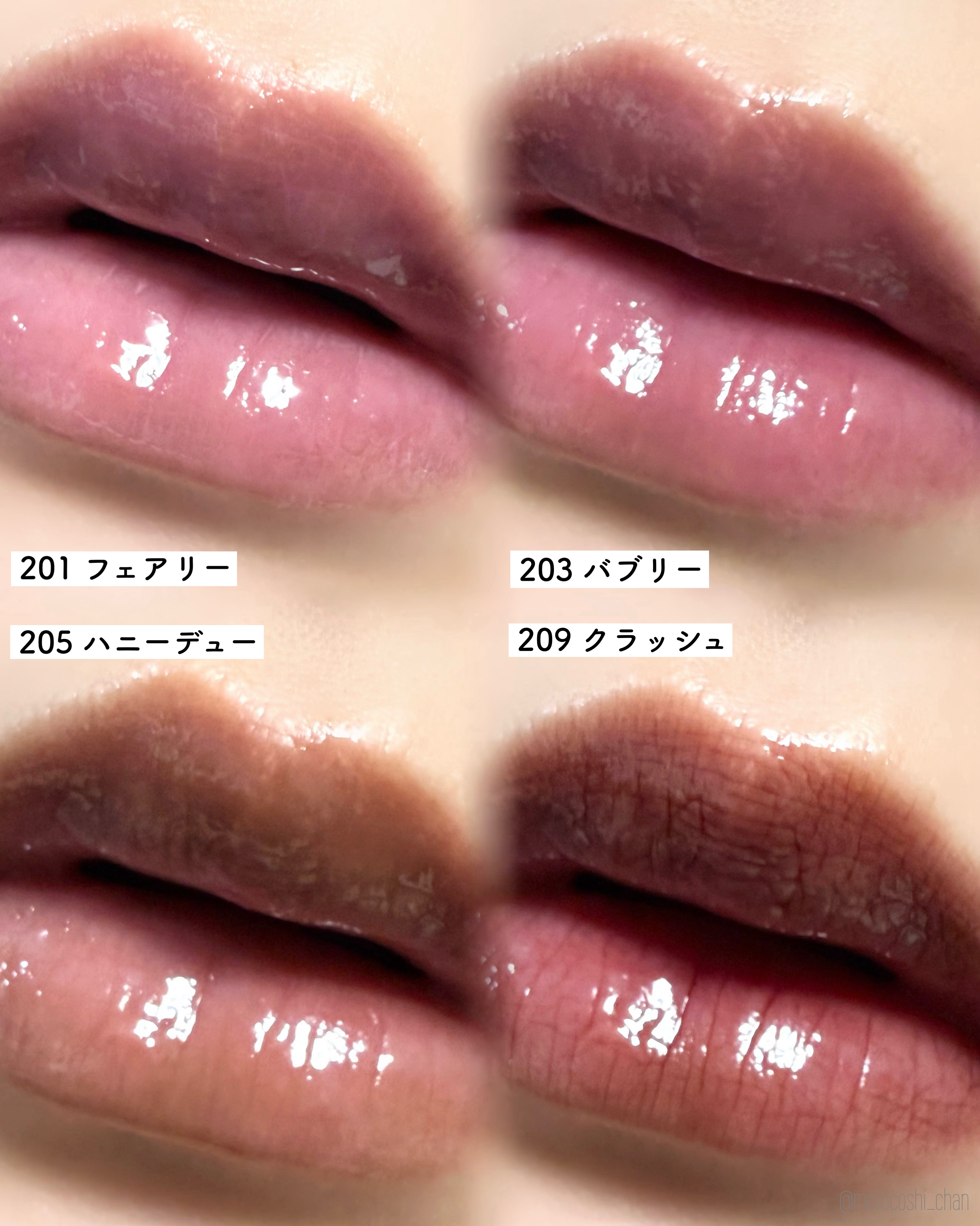 - <201 フェアリー> ダイマージリノール酸ジイソステアリル、ジフェニルシロキシフェニルトリメチコン、ビスジグリセリルポリアシルアジペート-2、水、ジフェニルジメチコン、水添ポリイソブテン、セチルPEG/PPG-10/1ジメチコン、ポリソルベート60、ペンチレングリコール、グリセリン、イソステアリン酸ポリグリセリル-4、フェノキシエタノール、1,2-ヘキサンジオール、セテアレス-20、酸化チタン (CI 77891)、(アクリル酸ヒドロキシエチル/アクリロイルジメチルタウリンNa)コポリマー、ステビオシド、スクワラン、香料、ジラウラミドグルタミドリシンNa、エチルヘキシルグリセリン、エチレンジアミンジコハク酸3Na、赤色227号 (CI 17200)、水酸化Al、黄色5号 (CI 15985)、ポリアクリル酸アンモニウム、イソステアリン酸ソルビタン、黄色4号 (CI 19140)、BG、赤色223号 (CI 45410)、青色1号 (CI 42090)、アラントイン、パンテノール、ツボクサエキス、ヒアルロン酸、加水分解ヒアルロン酸、ヒアルロン酸Na <203 バブリー> ダイマージリノール酸ジイソステアリル、ジフェニルシロキシフェニルトリメチコン、ビスジグリセリルポリアシルアジペート-2、水、ジフェニルジメチコン、水添ポリイソブテン、セチルPEG/PPG-10/1ジメチコン、ポリソルベート60、ペンチレングリコール、グリセリン、イソステアリン酸ポリグリセリル-4、フェノキシエタノール、1,2-ヘキサンジオール、セテアレス-20、(アクリル酸ヒドロキシエチル/アクリロイルジメチルタウリンNa)コポリマー、ステビオシド、酸化チタン (CI 77891)、スクワラン、香料、ジラウラミドグルタミドリシンNa、エチルヘキシルグリセリン、赤色227号 (CI 17200)、エチレンジアミンジコハク酸3Na、黄色5号 (CI 15985)、イソステアリン酸ソルビタン、水酸化Al、ポリアクリル酸アンモニウム、黄色4号 (CI 19140)、BG、青色1号 (CI 42090)、アラントイン、パンテノール、ツボクサエキス、ヒアルロン酸、加水分解ヒアルロン酸、ヒアルロン酸Na <204 レア> ダイマージリノール酸ジイソステアリル、ジフェニルシロキシフェニルトリメチコン、ビスジグリセリルポリアシルアジペート-2、水、ジフェニルジメチコン、水添ポリイソブテン、セチルPEG/PPG-10/1ジメチコン、ポリソルベート60、ペンチレングリコール、グリセリン、イソステアリン酸ポリグリセリル-4、フェノキシエタノール、1,2-ヘキサンジオール、セテアレス-20、(アクリル酸ヒドロキシエチル/アクリロイルジメチルタウリンNa)コポリマー、酸化チタン (CI 77891)、ステビオシド、スクワラン、香料、ジラウラミドグルタミドリシンNa、エチルヘキシルグリセリン、赤色227号 (CI 17200)、黄色5号 (CI 15985)、エチレンジアミンジコハク酸3Na、イソステアリン酸ソルビタン、水酸化Al、ポリアクリル酸アンモニウム、黄色4号 (CI 19140)、青色1号 (CI 42090)、BG、アラントイン、パンテノール、ツボクサエキス、ヒアルロン酸、加水分解ヒアルロン酸、ヒアルロン酸Na <205 ハニーデュー> ダイマージリノール酸ジイソステアリル、ジフェニルシロキシフェニルトリメチコン、ビスジグリセリルポリアシルアジペート-2、水、ジフェニルジメチコン、水添ポリイソブテン、セチルPEG/PPG-10/1ジメチコン、ポリソルベート60、ペンチレングリコール、グリセリン、イソステアリン酸ポリグリセリル-4、フェノキシエタノール、1,2-ヘキサンジオール、セテアレス-20、(アクリル酸ヒドロキシエチル/アクリロイルジメチルタウリンNa)コポリマー、酸化チタン (CI 77891)、ステビオシド、スクワラン、香料、ジラウラミドグルタミドリシンNa、エチルヘキシルグリセリン、赤色227号 (CI 17200)、黄色5号 (CI 15985)、エチレンジアミンジコハク酸3Na、イソステアリン酸ソルビタン、水酸化Al、ポリアクリル酸アンモニウム、黄色4号 (CI 19140)、青色1号 (CI 42090)、BG、アラントイン、パンテノール、ツボクサエキス、ヒアルロン酸、加水分解ヒアルロン酸、ヒアルロン酸Na <206 トフィー> ダイマージリノール酸ジイソステアリル、ジフェニルシロキシフェニルトリメチコン、ビスジグリセリルポリアシルアジペート-2、水、ジフェニルジメチコン、水添ポリイソブテン、セチルPEG/PPG-10/1ジメチコン、ポリソルベート60、ペンチレングリコール、グリセリン、イソステアリン酸ポリグリセリル-4、フェノキシエタノール、1,2-ヘキサンジオール、セテアレス-20、(アクリル酸ヒドロキシエチル/アクリロイルジメチルタウリンNa)コポリマー、ステビオシド、スクワラン、香料、ジラウラミドグルタミドリシンNa、酸化チタン (CI 77891)、エチルヘキシルグリセリン、黄色5号 (CI 15985)、エチレンジアミンジコハク酸3Na、黄色4号 (CI 19140)、赤色227号 (CI 17200)、イソステアリン酸ソルビタン、赤色223号 (CI 45410)、青色1号 (CI 42090)、水酸化Al、ポリアクリル酸アンモニウム、BG、アラントイン、パンテノール、ツボクサエキス、ヒアルロン酸、加水分解ヒアルロン酸、ヒアルロン酸Na <207 フレイム> ダイマージリノール酸ジイソステアリル、ジフェニルシロ