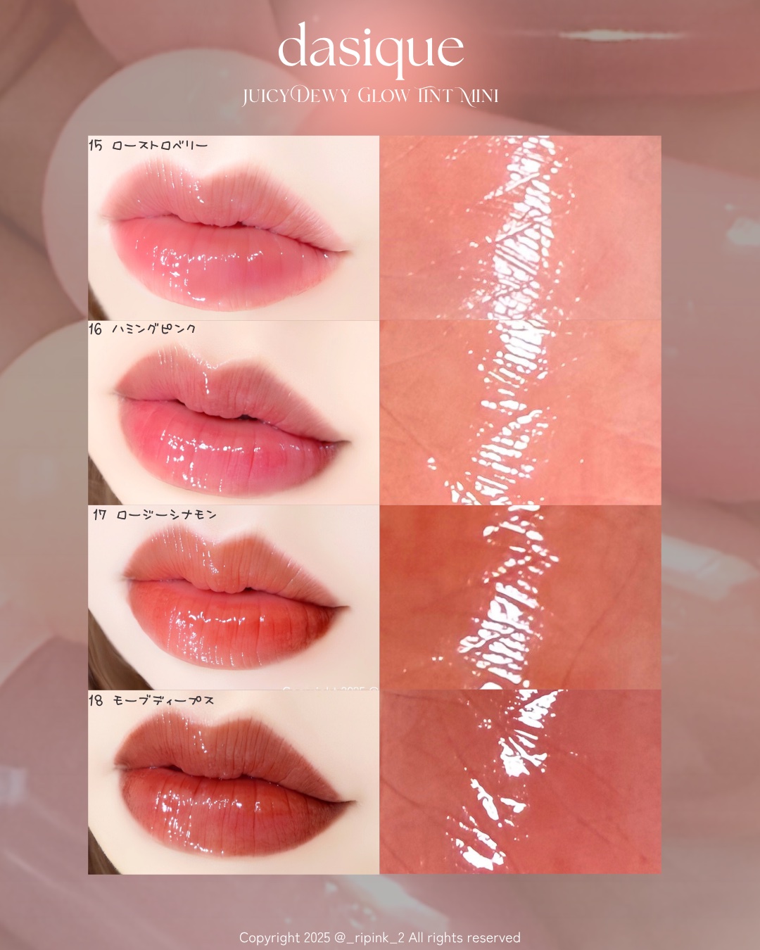 - 【夏新作2カラー登場!】 まるで果実のしずくがそのままリップになったような、みずみずしさと繊細なツヤを詰め込んだ「ジュージーデューイグロウティント」 夏新作で登場する新色「ベリーハート」、「タロミルク」は、透明感とふんわりとした色づきを徹底的にこだわって、何度もテストを重ねて生まれた特別なクールトーンカラー。 ひと塗りで唇をうるおし、重ねても重くならず、果実たっぷり!光をまとうような仕上がりに! - 蜂蜜に漬けた果物のように、うるちゅるふっくらとした果汁粘膜「ジューシーデュイグロウティント」 ミニだけの限定4色 15 ローストロベリー 16 ハミングピンク 17 ロージーシナモン 18 モーブディープス ♡唇に触れた途端、ぷるんと色っぽい果汁コーティング 果汁コーティングがじゅわっと唇に広がり、透明に輝くうるちゅる感を!蜂蜜に漬けた果物のようにぷるんぷるんとした唇を演出するグロウティント ♡イエベ、ブルべに合わせた多彩なカラーバリエーション 14色のカラーバリエーションで単独または、2色レイヤーリングして様々なリップメイクを演出 ♡ティント+リップグロスを一気に塗る効果! ティントの鮮やかな発色とリップグロスのうるうる透明ツヤ感が何度塗り重ねてもべたつかせず、唇にピタッと密着! 2025年11月1日(土)より、Qoo10公式ショップおよび東京フラッグシップストアにて発売予定