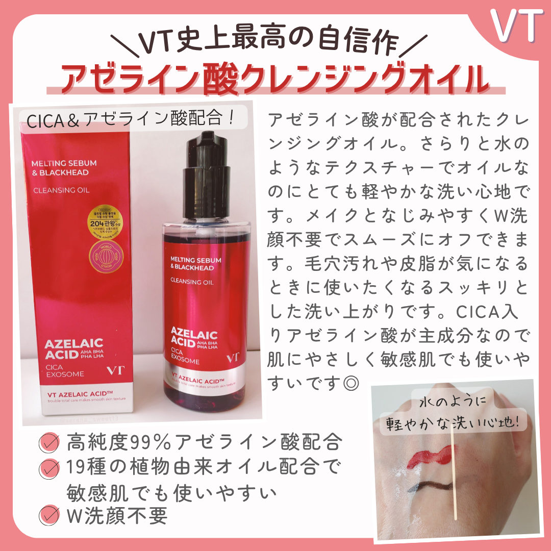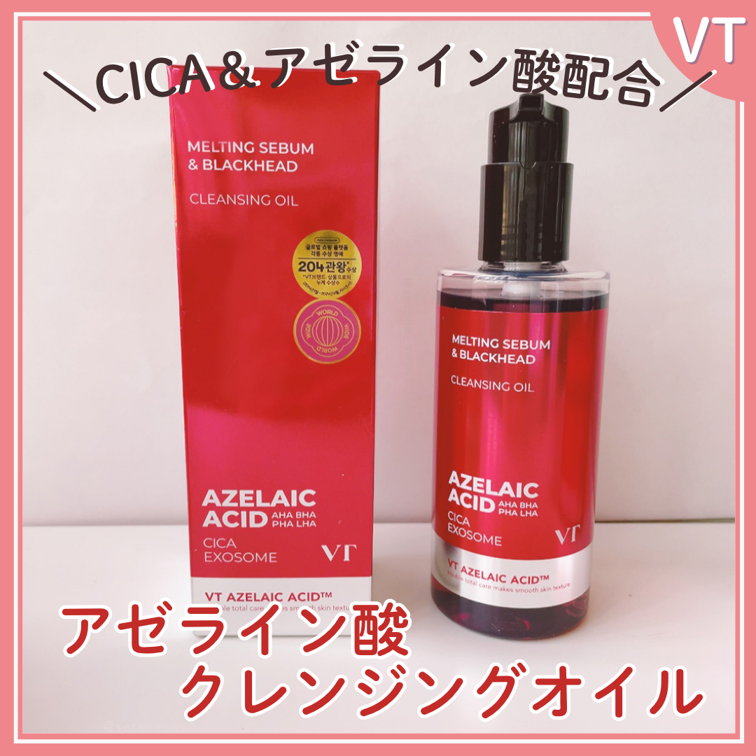 - 最近話題の毛穴ケア・整肌成分アゼライン酸!VTからはクレンジングオイルが登場! ポイントメイクまで落とすしっかりした洗浄力で、毛穴・皮脂までケアし保湿まで叶える一石三鳥アゼライン酸クレンジングオイル。 19種の植物性オイル*1も配合で、目に見えるブラッドヘッド*2から、隠れているホワイトヘッド*2、皮脂まですっきりケアします! ダブル洗顔不要! ※パッケージリニューアル ■このような方へおすすめ メイク・毛穴までディープクレンジング求める方 クレンジングでスキンケアまで行いたい方 ツッパリ感の少ないクレンジングを探していた方 ブラックヘッド*ケアも行いたい方 *1ダイズ油、アルガニアスピノサ核油、ユズ果実油、コメヌカ油、オタネニンジン種子油、アーモンド油、ザクロ種子油、リンゴ種子油、ホホバ種子油、ツバキ種子油、、バオバブ種子油、ユチャ種子油、ベニバナ種子油、ヒマワリ種子油、ヒポファエラムノイデス油、オリーブ果実油、アボカド油、アンズ核油、クロフサスグリ種子油(いずれも保湿) *2古い角質による