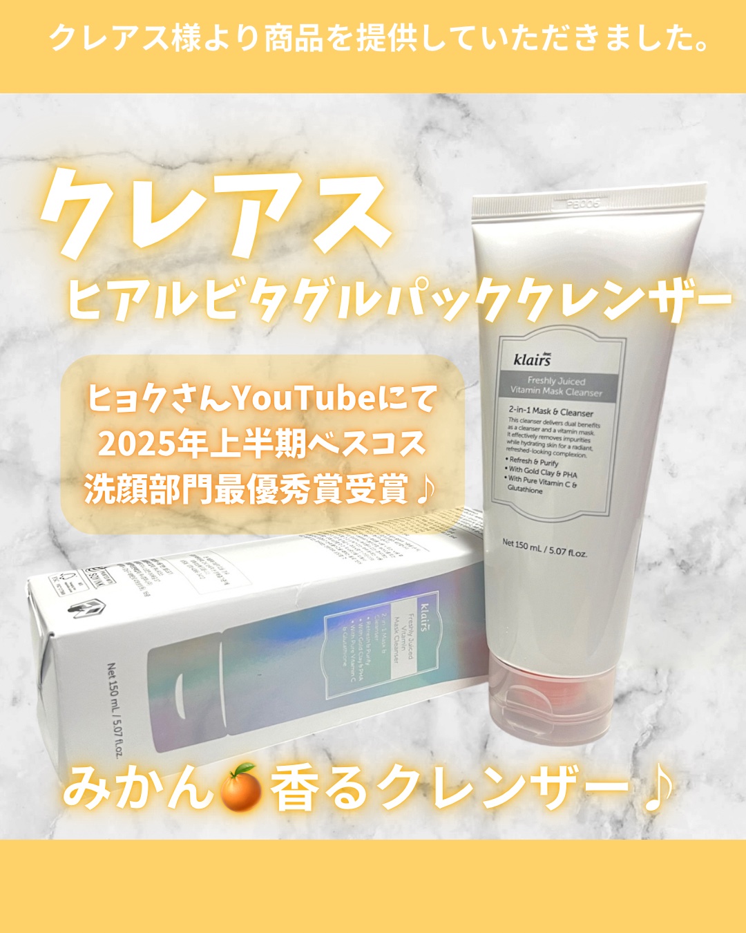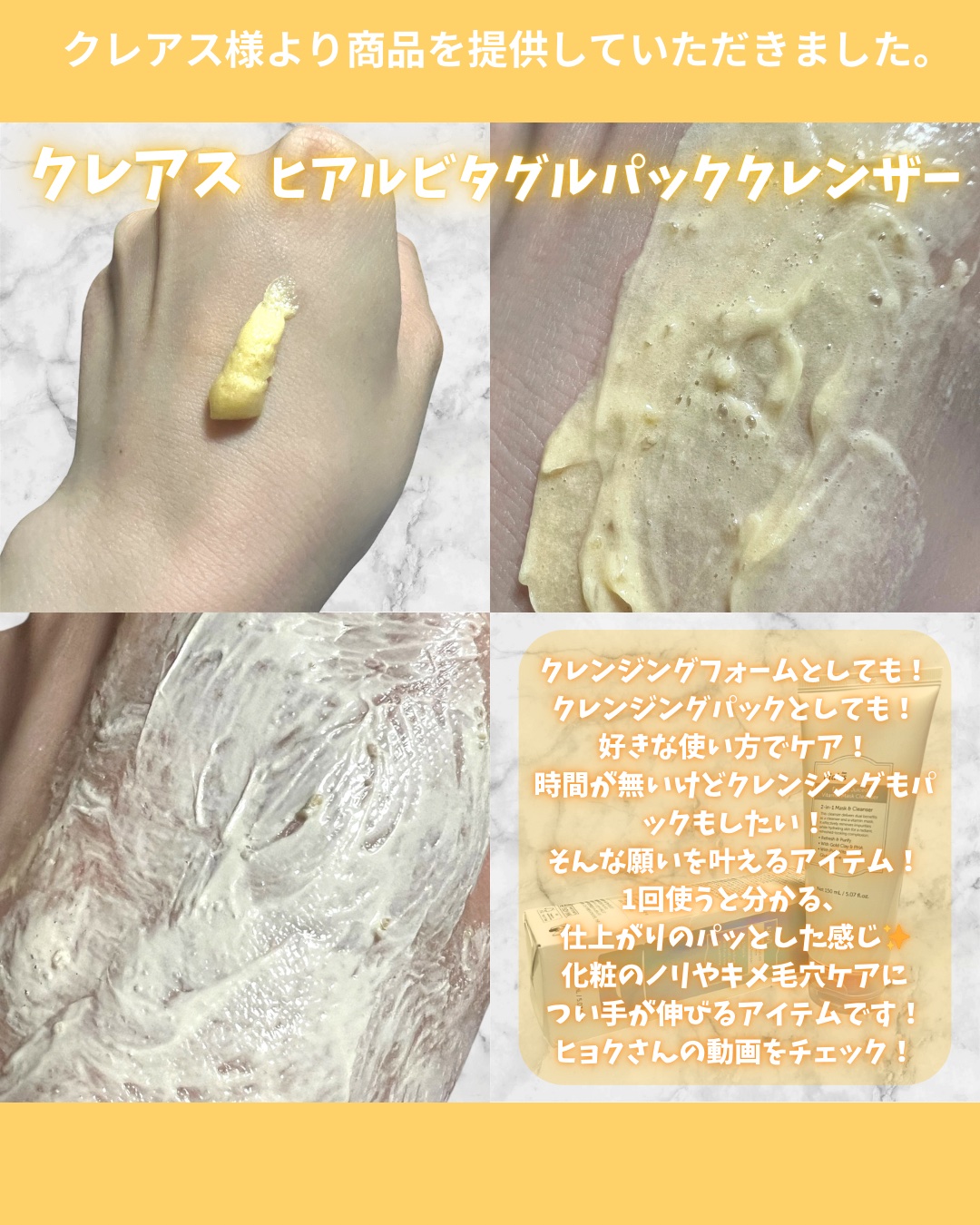 クレアスさんから提供されました💛ヒアルビタグルパッククレンザーHyuk(ヒョク)さんの上半期ベスコス紹介(YouTube)にも👏低刺激処方でクレンジングとパックが一度に♪毛穴、トーン、キメまでケア🫧ふわもち泡がやさしく密着して洗い上がりはツル...