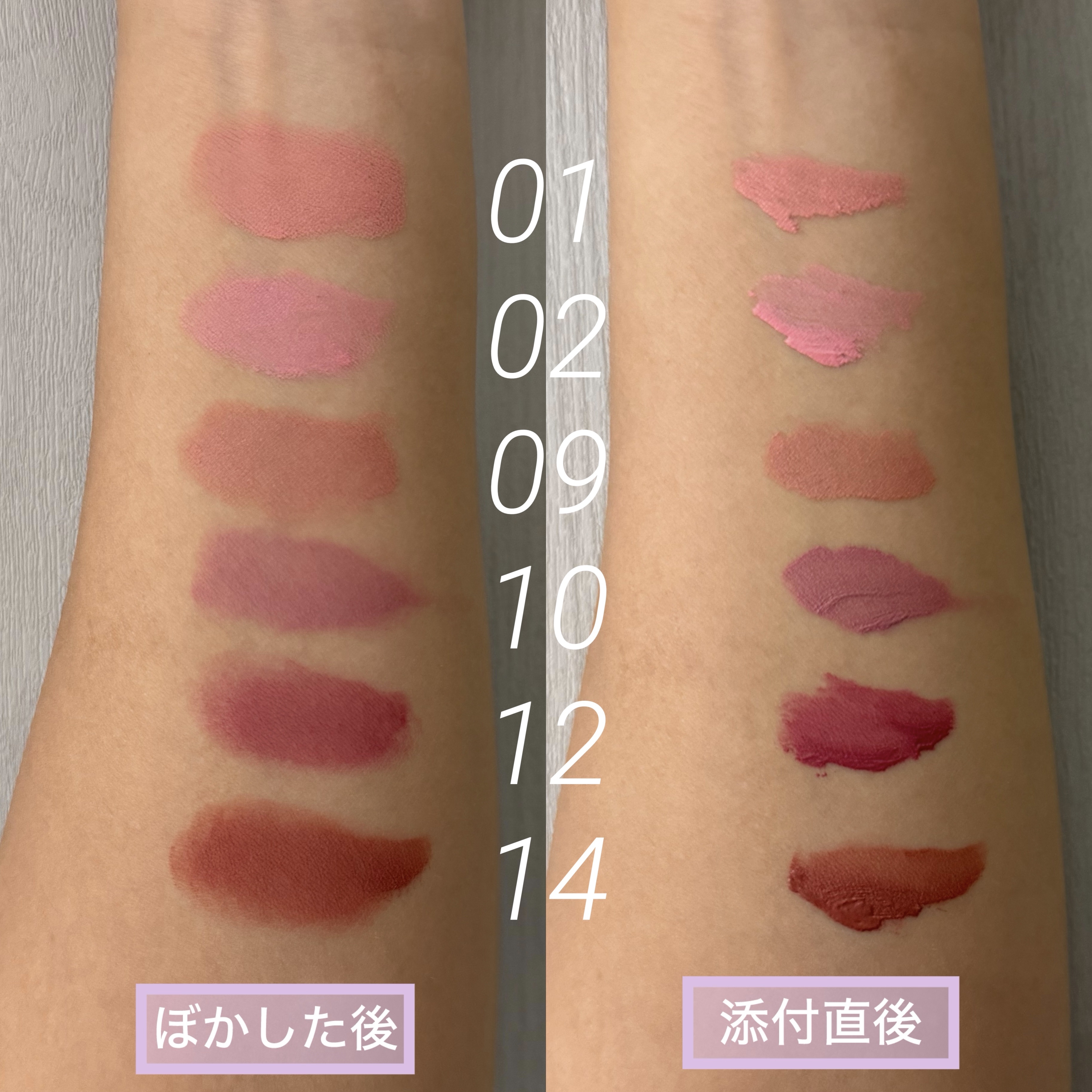 唇の色が血色よく見えるヌーデイカラー 独自のアプリケーターが縦皺に入り込んで消してくれる! プランピング効果で唇がボリュームアップ! しっかり密着して粘度高いのに、グロス独特のべたつきがない! しっかりした発色でリキッドルージュみたいなのに乾燥しないからめっちゃいい😳 プランピング効果で、むっちりボリュームが出た唇にしてくれる😭✨ どの色もパーソナルカラー選ばす使えそう〜 単独で塗ってもしっかり塗りで綺麗に発色します! マットリキッドと組み合わせたりして、色んな色味と雰囲気変えて使うのもお勧め♡