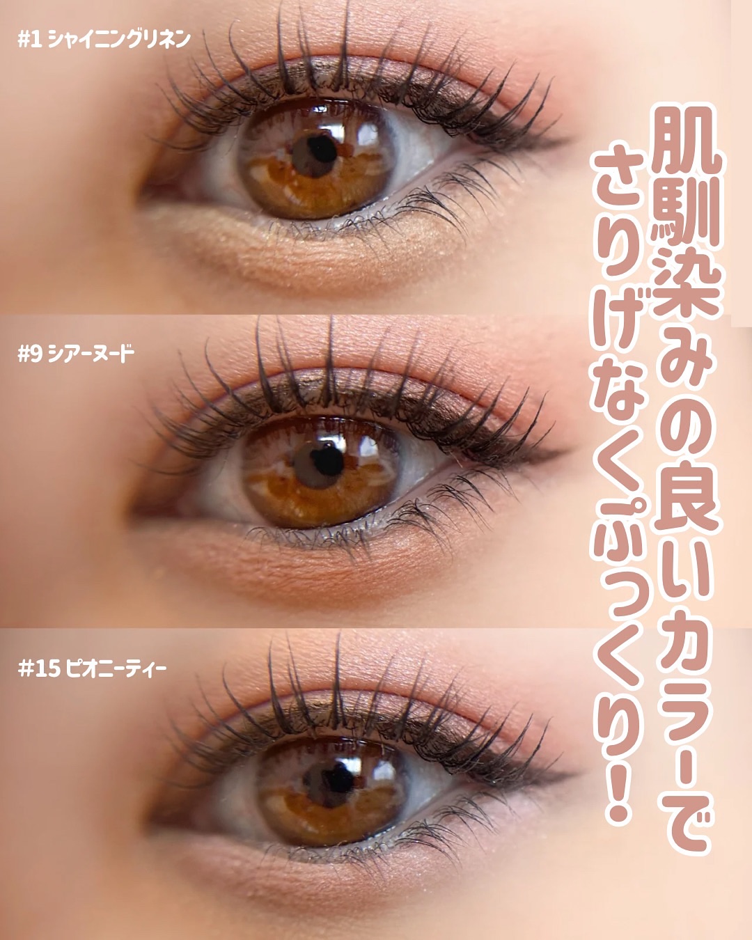 アルモニーアイズは2色で仕上げるのでテクニック要らずで、誰でも綺麗なグラデーションが出来るのが魅力🥺✨ ブラウンベースのカラーが豊富🙆♀️締め色がないので程よい抜け感が出ます🙌 キラキラしすぎない上品なパール感が本当に使いやすいですよ❤️ 3850円という価格も嬉しい✨ 左側のカラーを二重幅にのせてから、右側のカラーをアイホール全体にのせるだけ😊