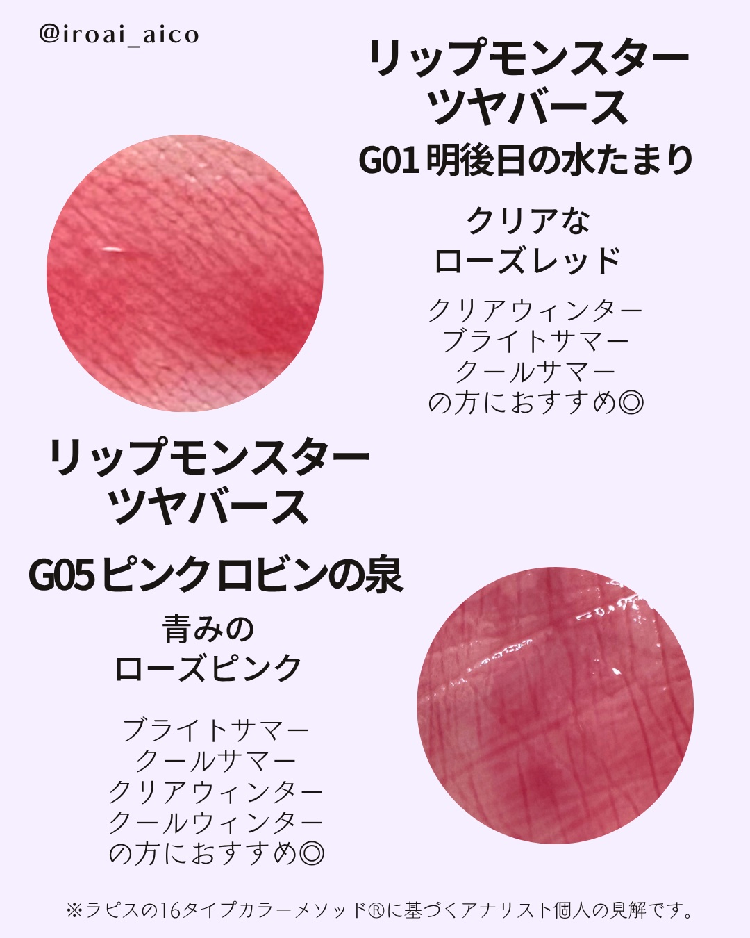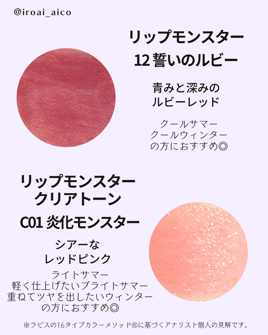 @iroai_aico#ブルベ夏#サマーの方におすすめのツヤ系#リップモンスターです!リップモンスター¥1,540クリアトーン¥1,320ツヤバース¥1,650※おすすめコスメはラピスの16タイプカラーメソッド®に基づくアナリスト個人の見解で...