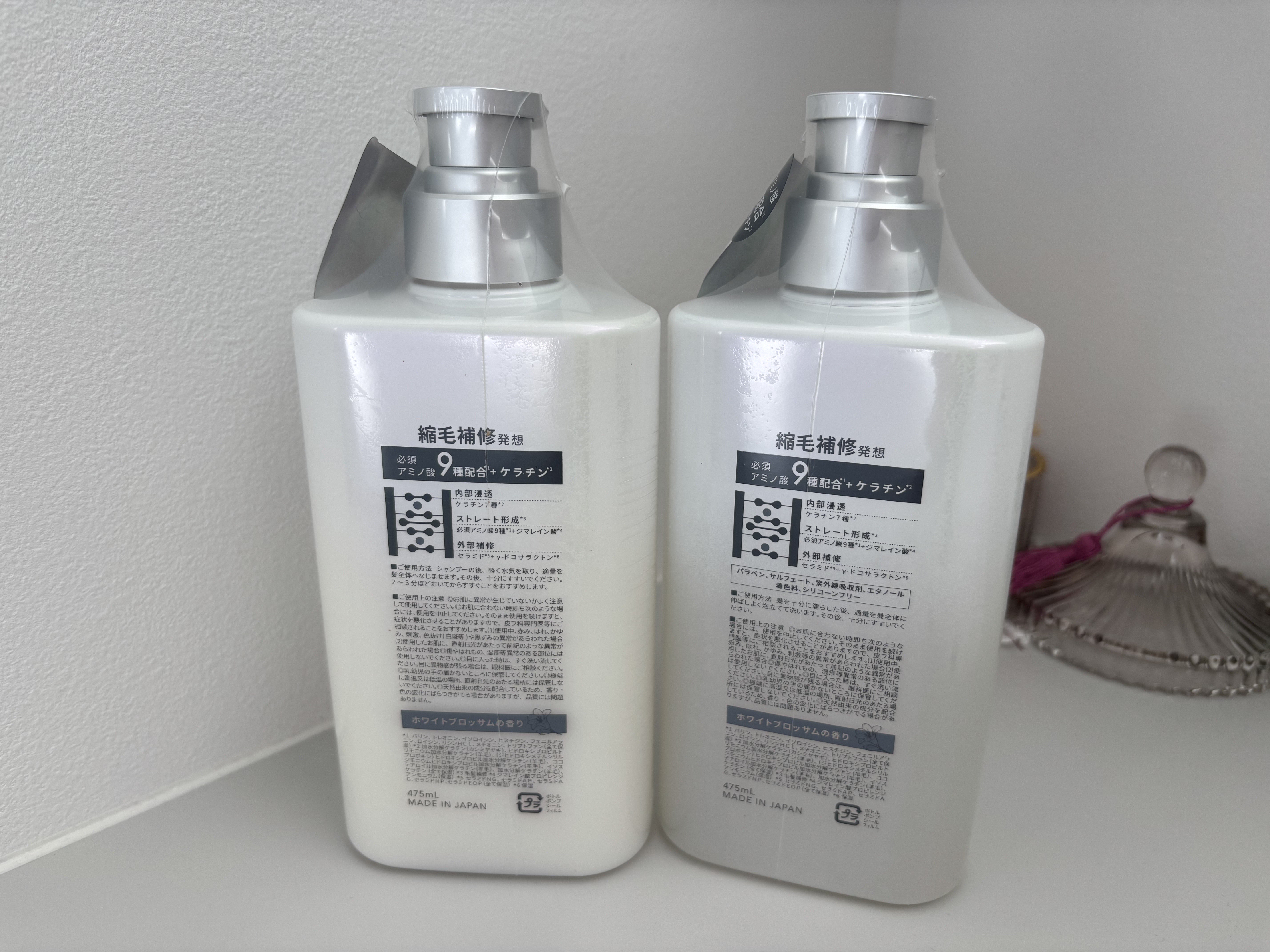 - <シャンプー> 水、コカミドプロピルベタイン、ラウラミドDEA、ラウリルグリコール酢酸Na、ココイル加水分解ケラチンK(羊毛)、ココイルメチルタウリンNa、ココイルグリシンNa、グリチルリチン酸2K、アラントイン、加水分解ケラチン(カシミヤヤギ)、加水分解ケラチン(羊毛)、加水分解シルク、ジマレイン酸プロピレンジアンモニウム、アミノエチルチオコハク酸ジアンモニウム、シスチン、グルタミン酸、アルギニン、リシンHCl、トレオニン、セリン、プロリン、ロイシン、バリン、アスパラギン酸、イソロイシン、グリシン、アラニン、フェニルアラニン、ヒスチジンHCl、メチオニン、トリプトファン、ヒドロキシプロピルトリモニウム加水分解ケラチン(羊毛)、(ジヒドロキシメチルシリルプロポキシ)ヒドロキシプロピル加水分解ケラチン(羊毛)、ココジモニウムヒドロキシプロピル加水分解ケラチン(羊毛)、イソステアロイル加水分解ケラチン(羊毛)、ケラチン、セラミドNP、セラミドNG、セラミドAP、セラミドEOP、セラミドAG、セテアラミドエチルジエトニウム加水分解コメタンパク、ラノリン脂肪酸、γ-ドコサラクトン、スイゼンジノリ多糖体、ヒスチジン、フィトステロールズ、PCA-Na、トリ(カプリル酸/カプリン酸)グリセリル、水添レシチン、グリセリン、BG、タウリン、ヤシ油脂肪酸PEG-7グリセリル、ポリクオタニウムー7、ポリクオタニウムー10、ヒドロキシプロピルシクロデキストリン、エチドロン酸、クエン酸、ブチルカルバミン酸ヨウ化プロピニル、エチドロン酸4Na、EDTA-4Na、イソノナン酸イソノニル、乳酸Na、ラウラミノプロピオン酸Na、PCA、塩化アンモニウム、香料、フェノキシエタノール <トリートメント> 水、セテアリルアルコール、アモジメチコン、ダイマージリノール酸水添ヒマシ油、BG、ベヘントリモニウムクロリド、加水分解シルク、加水分解ケラチン(カシミヤヤギ)、アミノエチルチオコハク酸ジアンモニウム、γ-ドコサラクトン、セテアラミドエチルジエトニウム加水分解コメタンパク、ラノリン脂肪酸、ジグルコシル没食子酸、ジマレイン酸プロピレンジアンモニウム、シスチン、グルタミン酸、アルギニン、リシンHCl、トレオニン、セラミドNG、セラミドAP、セラミドAG、セラミドNP、セラミドEOP、スイゼンジノリ多糖体、セリン、プロリン、ロイシン、バリン、アスパラギン酸、イソロイシン、グリシン、アラニン、フェニルアラニン、ヒスチジンHCl、メチオニン、トリプトファン、グリチルリチン酸2K、アラントイン、ヒドロキシプロピルトリモニウム加水分解ケラチン(羊毛)、(ジヒドロキシメチルシリルプロポキシ)ヒドロキシプロピル加水分解ケラチン(羊毛)、ココジモニウムヒドロキシプロピル加水分解ケラチン(羊毛)、イソステアロイル加水分解ケラチン(羊毛)、加水分解ケラチン(羊毛)、ケラチン、ヒスチジン、フィトステロールズ、PCA-Na、乳酸Na、ラウラミノプロピオン酸Na、PCA、クエン酸、ヒドロキシプロピルデンプンリン酸、イソプロパノール、トリ(カプリル酸/カプリン酸)グリセリル、グリセリン、イソノナン酸イソノニル、水添レシチン、タウリン、セトリモニウムクロリド、塩化アンモニウム、香料、フェノキシエタノール <シャンプー(詰め替え) 400mL> 水、コカミドプロピルベタイン、ラウラミドDEA、ラウリルグリコール酢酸Na、ココイル加水分解ケラチンK(羊毛)、ココイルメチルタウリンNa、ココイルグリシンNa、グリチルリチン酸2K、アラントイン、加水分解ケラチン(カシミヤヤギ)、加水分解ケラチン(羊毛)、加水分解シルク、ジマレイン酸プロピレンジアンモニウム、アミノエチルチオコハク酸ジアンモニウム、シスチン、グルタミン酸、アルギニン、リシンHCl、トレオニン、セリン、プロリン、ロイシン、バリン、アスパラギン酸、イソロイシン、グリシン、アラニン、フェニルアラニン、ヒスチジンHCl、メチオニン、トリプトファン、ヒドロキシプロピルトリモニウム加水分解ケラチン(羊毛)、(ジヒドロキシメチルシリルプロポキシ)ヒドロキシプロピル加水分解ケラチン(羊毛)、ココジモニウムヒドロキシプロピル加水分解ケラチン(羊毛)、イソステアロイル加水分解ケラチン(羊毛)、ケラチン、セラミドNP、セラミドNG、セラミドAP、セラミドEOP、セラミドAG、セテアラミドエチルジエトニウム加水分解コメタンパク、ラノリン脂肪酸、γ-ドコサラクトン、スイゼンジノリ多糖体、ヒスチジン、フィトステロールズ、PCA-Na、トリ(カプリル酸/カプリン酸)グリセリル、水添レシチン、グリセリン、BG、タウリン、ヤシ油脂肪酸PEG-7グリセリル、ポリクオタニウムー7、ポリクオタニウムー10、ヒドロキシプロピルシクロデキストリン、エチドロン酸、クエン酸、ブチルカルバミン酸ヨウ化プロピニル、エチドロン酸4Na、EDTA-4Na、イソノナン酸イソノニル、乳酸Na、ラウラミノプロピオン酸Na、PCA、塩化アンモニウム、香料、フェノキシエタノール <シャンプー 大容量詰め替え(1,000mL)> 水、コ