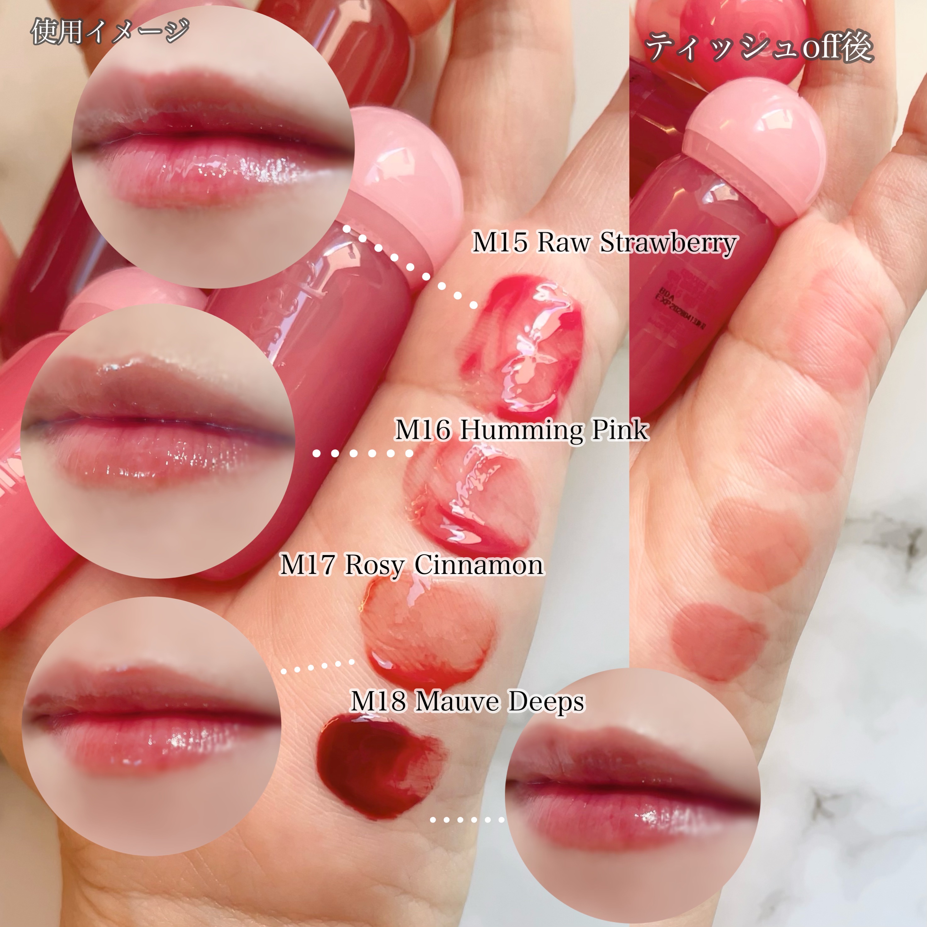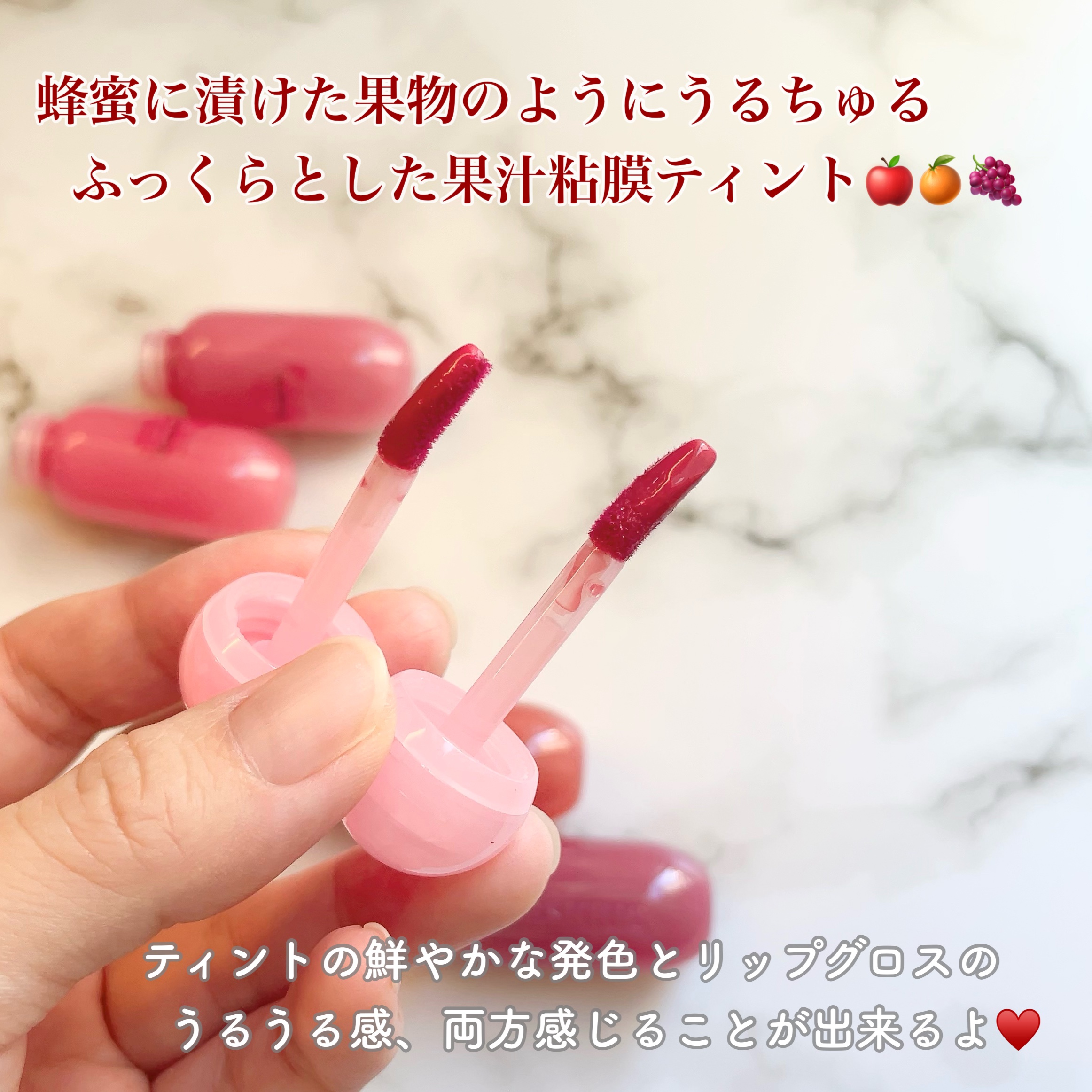 - 【夏新作2カラー登場!】 まるで果実のしずくがそのままリップになったような、みずみずしさと繊細なツヤを詰め込んだ「ジュージーデューイグロウティント」 夏新作で登場する新色「ベリーハート」、「タロミルク」は、透明感とふんわりとした色づきを徹底的にこだわって、何度もテストを重ねて生まれた特別なクールトーンカラー。 ひと塗りで唇をうるおし、重ねても重くならず、果実たっぷり!光をまとうような仕上がりに! - 蜂蜜に漬けた果物のように、うるちゅるふっくらとした果汁粘膜「ジューシーデュイグロウティント」 ミニだけの限定4色 15 ローストロベリー 16 ハミングピンク 17 ロージーシナモン 18 モーブディープス ♡唇に触れた途端、ぷるんと色っぽい果汁コーティング 果汁コーティングがじゅわっと唇に広がり、透明に輝くうるちゅる感を!蜂蜜に漬けた果物のようにぷるんぷるんとした唇を演出するグロウティント ♡イエベ、ブルべに合わせた多彩なカラーバリエーション 14色のカラーバリエーションで単独または、2色レイヤーリングして様々なリップメイクを演出 ♡ティント+リップグロスを一気に塗る効果! ティントの鮮やかな発色とリップグロスのうるうる透明ツヤ感が何度塗り重ねてもべたつかせず、唇にピタッと密着! 2025年11月1日(土)より、Qoo10公式ショップおよび東京フラッグシップストアにて発売予定
