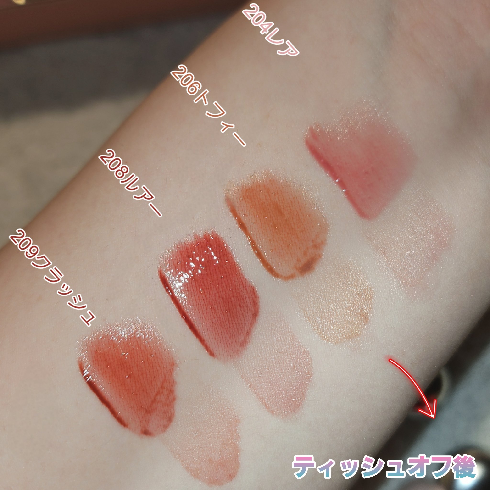 - <201 フェアリー> ダイマージリノール酸ジイソステアリル、ジフェニルシロキシフェニルトリメチコン、ビスジグリセリルポリアシルアジペート-2、水、ジフェニルジメチコン、水添ポリイソブテン、セチルPEG/PPG-10/1ジメチコン、ポリソルベート60、ペンチレングリコール、グリセリン、イソステアリン酸ポリグリセリル-4、フェノキシエタノール、1,2-ヘキサンジオール、セテアレス-20、酸化チタン (CI 77891)、(アクリル酸ヒドロキシエチル/アクリロイルジメチルタウリンNa)コポリマー、ステビオシド、スクワラン、香料、ジラウラミドグルタミドリシンNa、エチルヘキシルグリセリン、エチレンジアミンジコハク酸3Na、赤色227号 (CI 17200)、水酸化Al、黄色5号 (CI 15985)、ポリアクリル酸アンモニウム、イソステアリン酸ソルビタン、黄色4号 (CI 19140)、BG、赤色223号 (CI 45410)、青色1号 (CI 42090)、アラントイン、パンテノール、ツボクサエキス、ヒアルロン酸、加水分解ヒアルロン酸、ヒアルロン酸Na <203 バブリー> ダイマージリノール酸ジイソステアリル、ジフェニルシロキシフェニルトリメチコン、ビスジグリセリルポリアシルアジペート-2、水、ジフェニルジメチコン、水添ポリイソブテン、セチルPEG/PPG-10/1ジメチコン、ポリソルベート60、ペンチレングリコール、グリセリン、イソステアリン酸ポリグリセリル-4、フェノキシエタノール、1,2-ヘキサンジオール、セテアレス-20、(アクリル酸ヒドロキシエチル/アクリロイルジメチルタウリンNa)コポリマー、ステビオシド、酸化チタン (CI 77891)、スクワラン、香料、ジラウラミドグルタミドリシンNa、エチルヘキシルグリセリン、赤色227号 (CI 17200)、エチレンジアミンジコハク酸3Na、黄色5号 (CI 15985)、イソステアリン酸ソルビタン、水酸化Al、ポリアクリル酸アンモニウム、黄色4号 (CI 19140)、BG、青色1号 (CI 42090)、アラントイン、パンテノール、ツボクサエキス、ヒアルロン酸、加水分解ヒアルロン酸、ヒアルロン酸Na <204 レア> ダイマージリノール酸ジイソステアリル、ジフェニルシロキシフェニルトリメチコン、ビスジグリセリルポリアシルアジペート-2、水、ジフェニルジメチコン、水添ポリイソブテン、セチルPEG/PPG-10/1ジメチコン、ポリソルベート60、ペンチレングリコール、グリセリン、イソステアリン酸ポリグリセリル-4、フェノキシエタノール、1,2-ヘキサンジオール、セテアレス-20、(アクリル酸ヒドロキシエチル/アクリロイルジメチルタウリンNa)コポリマー、酸化チタン (CI 77891)、ステビオシド、スクワラン、香料、ジラウラミドグルタミドリシンNa、エチルヘキシルグリセリン、赤色227号 (CI 17200)、黄色5号 (CI 15985)、エチレンジアミンジコハク酸3Na、イソステアリン酸ソルビタン、水酸化Al、ポリアクリル酸アンモニウム、黄色4号 (CI 19140)、青色1号 (CI 42090)、BG、アラントイン、パンテノール、ツボクサエキス、ヒアルロン酸、加水分解ヒアルロン酸、ヒアルロン酸Na <205 ハニーデュー> ダイマージリノール酸ジイソステアリル、ジフェニルシロキシフェニルトリメチコン、ビスジグリセリルポリアシルアジペート-2、水、ジフェニルジメチコン、水添ポリイソブテン、セチルPEG/PPG-10/1ジメチコン、ポリソルベート60、ペンチレングリコール、グリセリン、イソステアリン酸ポリグリセリル-4、フェノキシエタノール、1,2-ヘキサンジオール、セテアレス-20、(アクリル酸ヒドロキシエチル/アクリロイルジメチルタウリンNa)コポリマー、酸化チタン (CI 77891)、ステビオシド、スクワラン、香料、ジラウラミドグルタミドリシンNa、エチルヘキシルグリセリン、赤色227号 (CI 17200)、黄色5号 (CI 15985)、エチレンジアミンジコハク酸3Na、イソステアリン酸ソルビタン、水酸化Al、ポリアクリル酸アンモニウム、黄色4号 (CI 19140)、青色1号 (CI 42090)、BG、アラントイン、パンテノール、ツボクサエキス、ヒアルロン酸、加水分解ヒアルロン酸、ヒアルロン酸Na <206 トフィー> ダイマージリノール酸ジイソステアリル、ジフェニルシロキシフェニルトリメチコン、ビスジグリセリルポリアシルアジペート-2、水、ジフェニルジメチコン、水添ポリイソブテン、セチルPEG/PPG-10/1ジメチコン、ポリソルベート60、ペンチレングリコール、グリセリン、イソステアリン酸ポリグリセリル-4、フェノキシエタノール、1,2-ヘキサンジオール、セテアレス-20、(アクリル酸ヒドロキシエチル/アクリロイルジメチルタウリンNa)コポリマー、ステビオシド、スクワラン、香料、ジラウラミドグルタミドリシンNa、酸化チタン (CI 77891)、エチルヘキシルグリセリン、黄色5号 (CI 15985)、エチレンジアミンジコハク酸3Na、黄色4号 (CI 19140)、赤色227号 (CI 17200)、イソステアリン酸ソルビタン、赤色223号 (CI 45410)、青色1号 (CI 42090)、水酸化Al、ポリアクリル酸アンモニウム、BG、アラントイン、パンテノール、ツボクサエキス、ヒアルロン酸、加水分解ヒアルロン酸、ヒアルロン酸Na <207 フレイム> ダイマージリノール酸ジイソステアリル、ジフェニルシロ