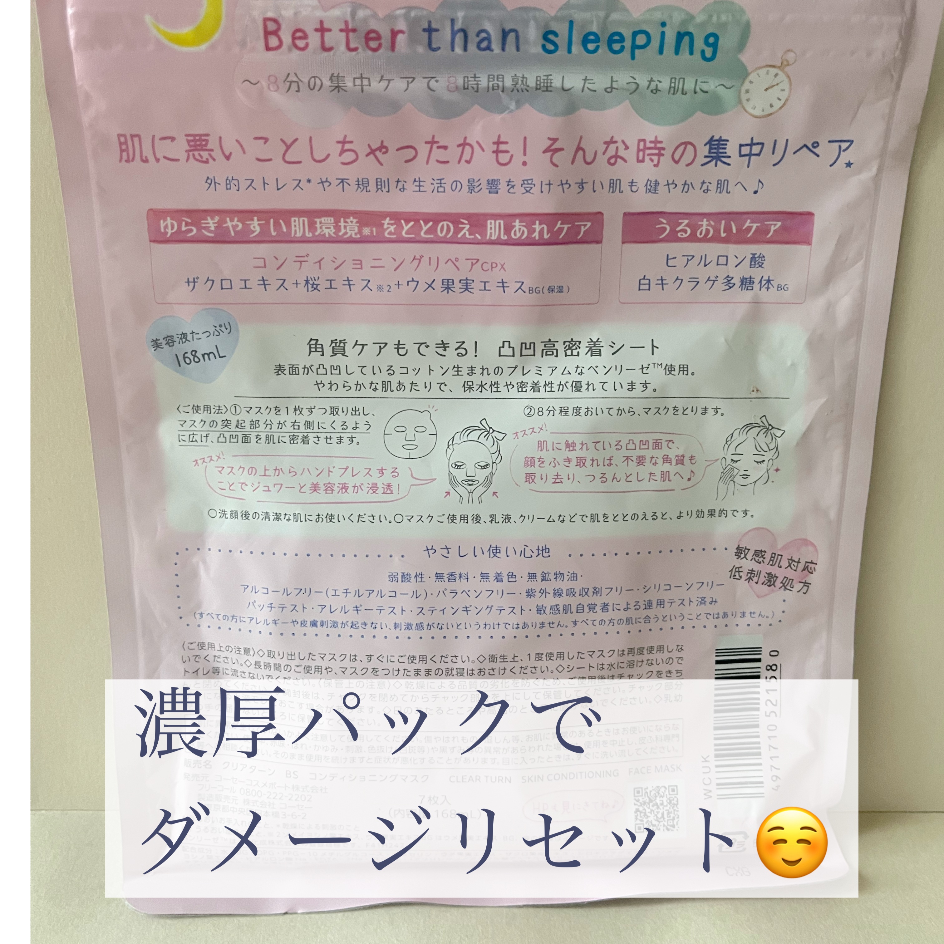 - 【クリアターン ごめんね素肌マスク】 負担をかけて、あれてしまった肌の素肌環境※1をととのえる“速攻集中リペア※2マスク”です。 ① あれがちな肌を素早くコンディションケア! ザクロエキス、桜エキス※3、ウメ果実エキスBG配合し、ゆらぎやすい肌環境をととのえ、肌あれをケアします。また、うるおいケア成分として、ヒアルロン酸、白キクラゲ多糖体BGを配合。外的ストレス※4や不規則な生活の影響を受けやすい肌も健やかでゆらぎにくい肌へみちびきます。 ②敏感肌も使える、弱酸性・低刺激処方 無香料・無着色・無鉱物油・アルコールフリー(エチルアルコール)・パラベンフリー・紫外線吸収剤フリー・シリコーンフリー・パッチテスト済み・アレルギーテスト済み・スティンギングテスト済み・敏感肌自覚者による連用テスト済み(すべての方にアレルギーや皮膚刺激が起きない、刺激感がないというわけではありません。すべての方の肌に合うということではありません。) ③角質ケアもできる!凸凹高密着シート コットン生まれのやわらかな肌触りのベンリーゼを使用。 表面に凸凹のエンボス加工を施しているため、密着性が高く、はがしたマスクでやさしく顔をふきとることで角質ケアもできます。 ※1 うるおい環境のこと ※2 うるおいお手入れのこと ※3 ソメイヨシノ葉エキス、ウメ果実エキスBGはウメ果実エキス・BG(保湿) ※4 乾燥による刺激のこと