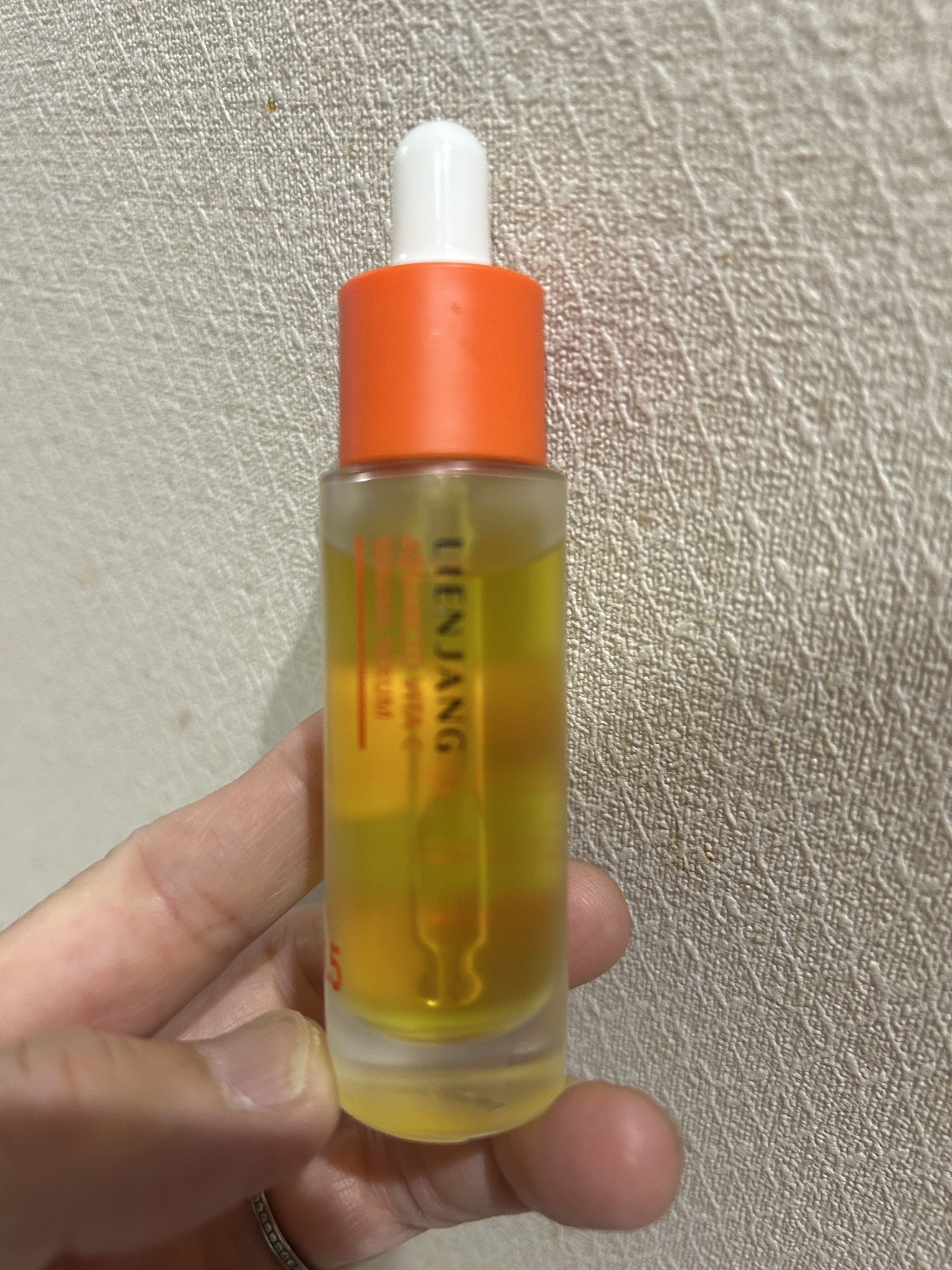 LIENJANGアドバンスドビタCセラムを使いました。オレンジ色?黄色?をしている美容液ですね。純粋ビタミンC※1と、グルタチオン※2と、ビタミンE※3のトリプル成分が毛穴※4・くすみ※5・ゆるみ※6に集中ケアしてくれるそうです。ツヤめく滑ら...