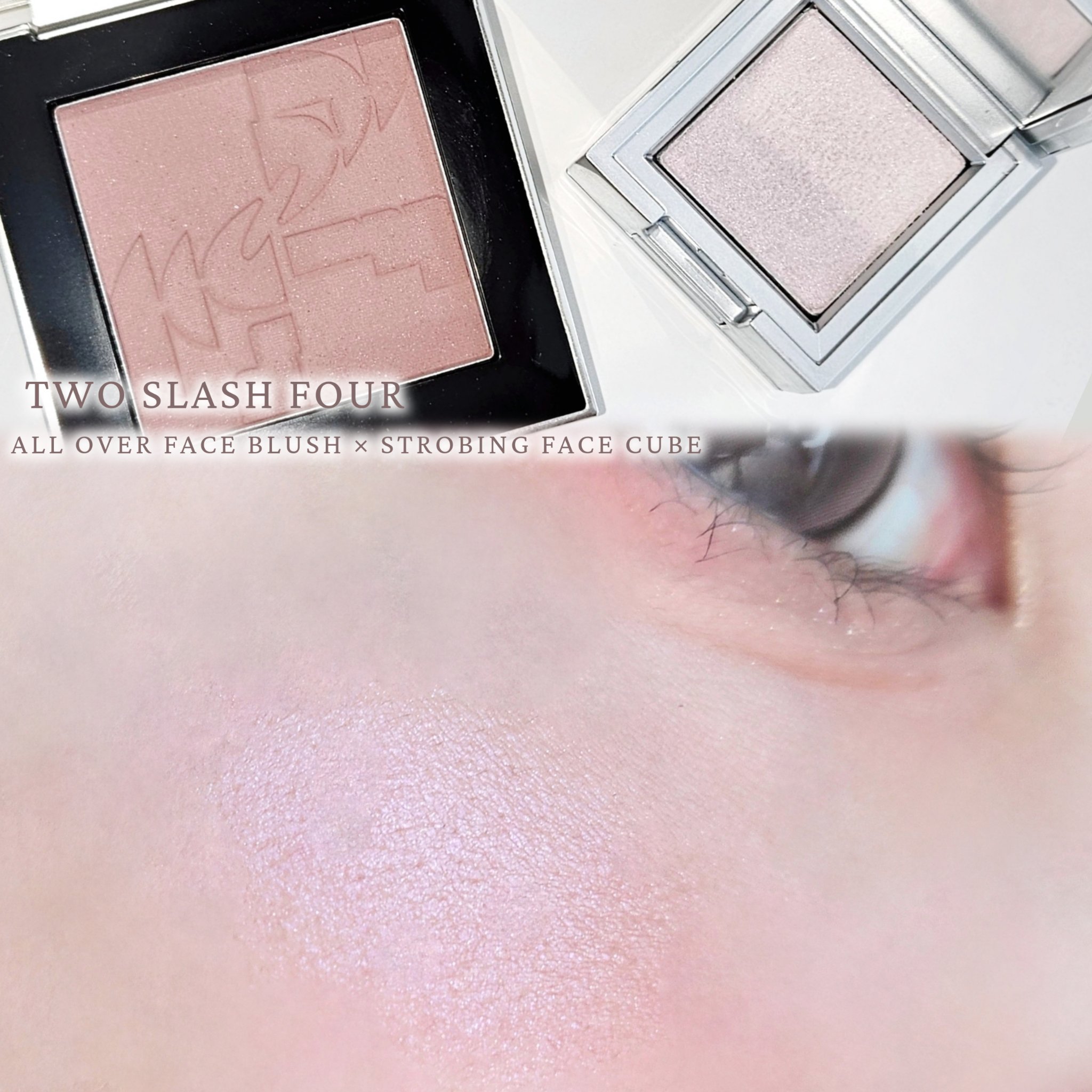 #PRTWOSLASHFOUR様(X@twoslashfour)よりオールオーバーフェイスブラッシュバーンピンクストロービングフェイスキューブパープルを頂き試しましたパープルみを帯びたチークとパープルのハイライトのレイヤリングが神秘的でかわい...
