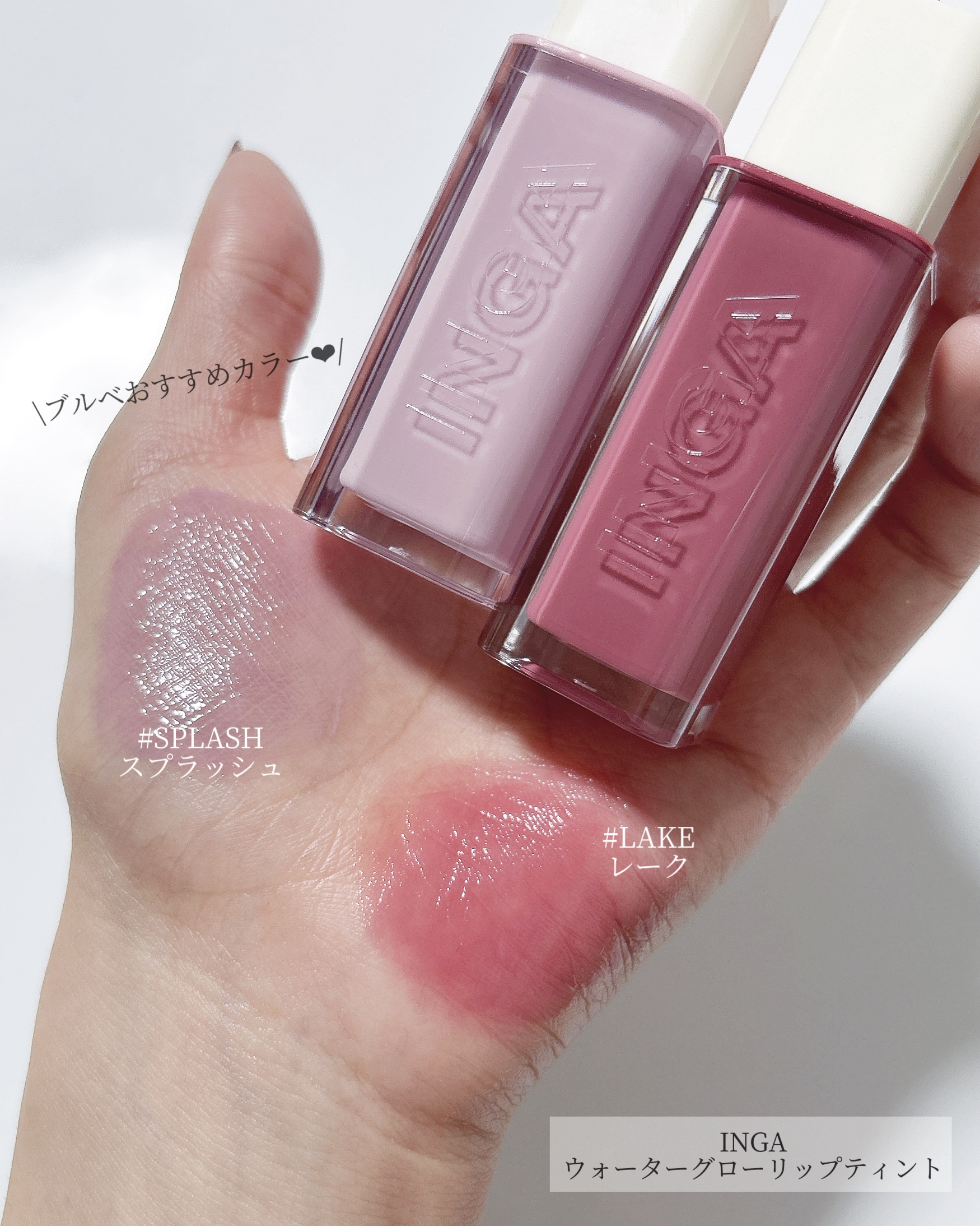 INGA様の「WATERGLOWLIPTINT(SPLASH・LAKE)」をお試しさせて頂きました(*ˊ˘ˋ*)✨パーソナルカラーで選べる13色展開‼️だから自分の好みのカラーがきっと見つかる😍私は、今回ブルベカラーであるスプラッシュとレーク...