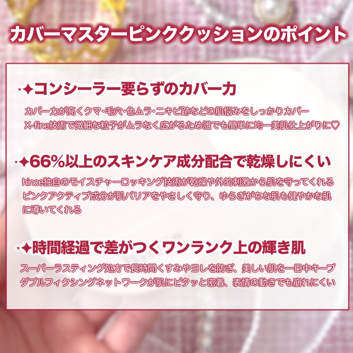 ☆hinceカバーマスターピンククッション&ラディアンスメイクアップブースティングプレップミニ💖hinceカバーマスターピンククッション17ホリデー限定パッケージPOINT:1️⃣薄膜でキマる、コンシーラー要らずのカバー力。クマ・毛穴・色ムラ...