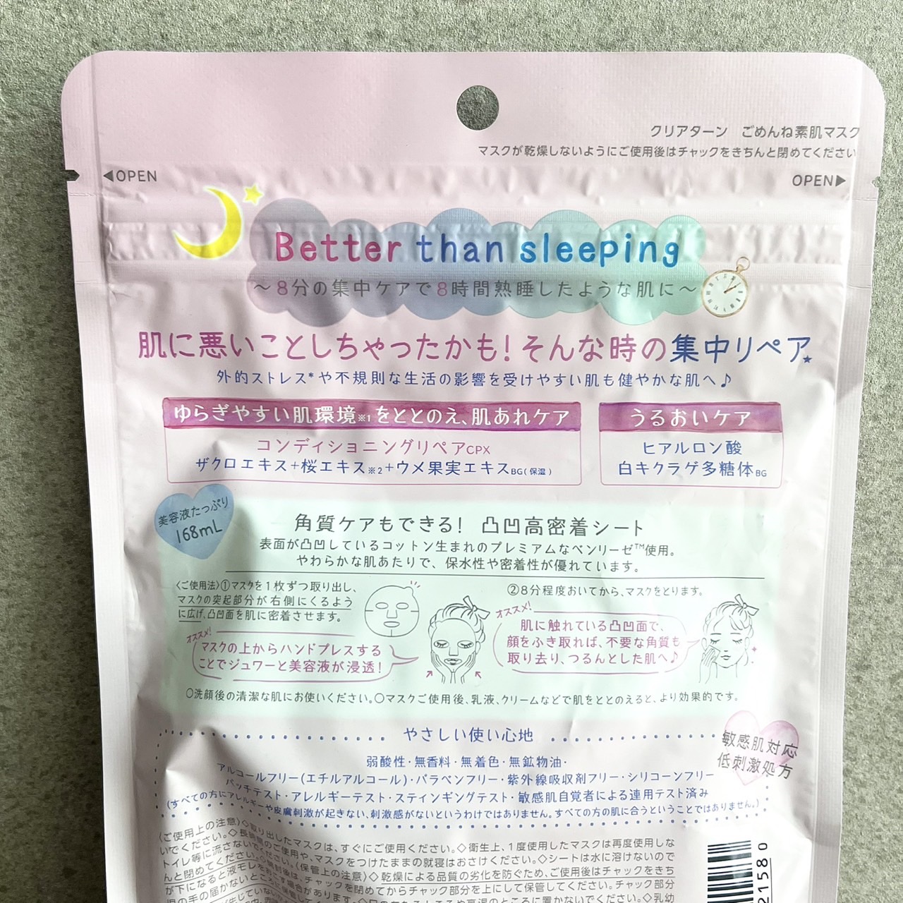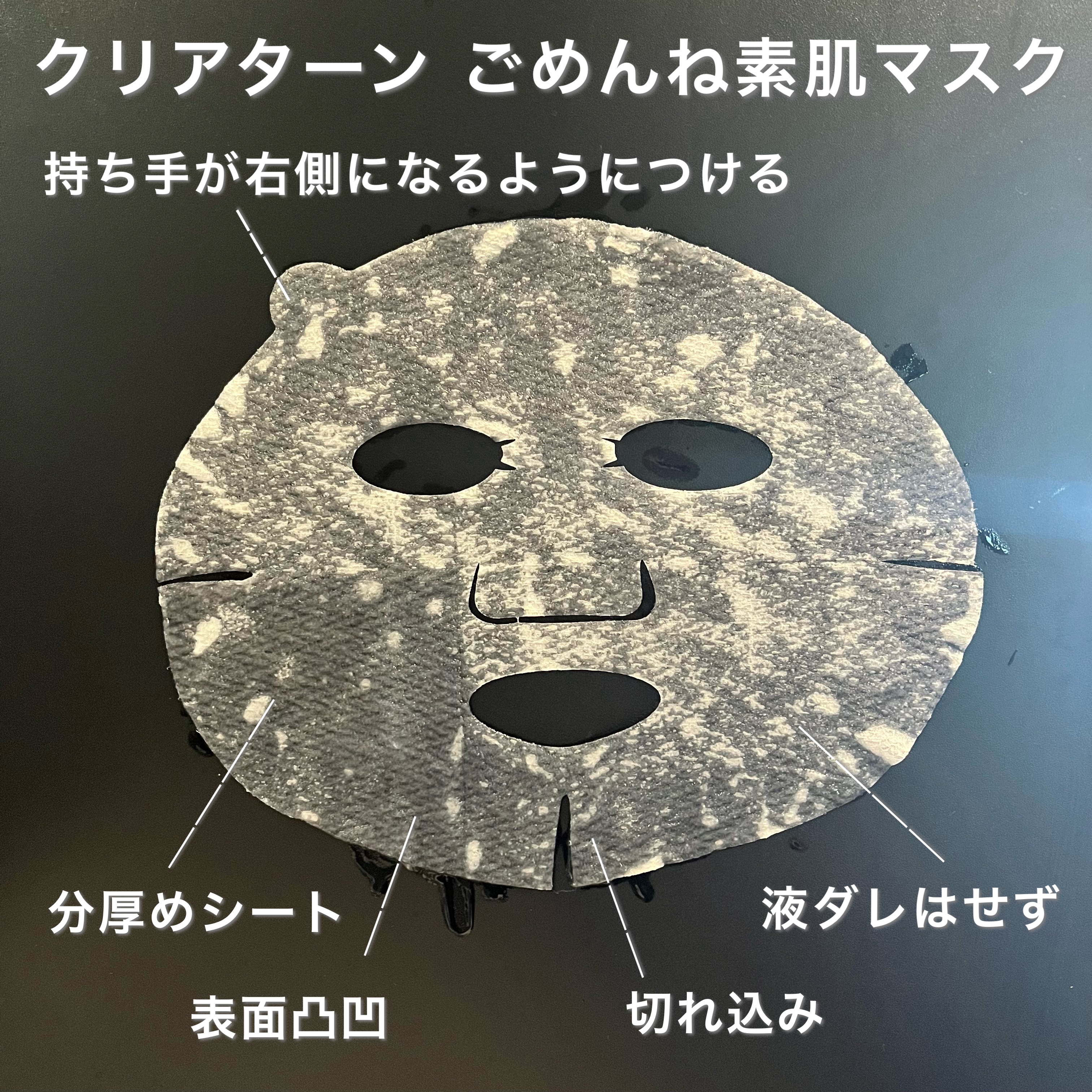 - 【クリアターン ごめんね素肌マスク】 負担をかけて、あれてしまった肌の素肌環境※1をととのえる“速攻集中リペア※2マスク”です。 ① あれがちな肌を素早くコンディションケア! ザクロエキス、桜エキス※3、ウメ果実エキスBG配合し、ゆらぎやすい肌環境をととのえ、肌あれをケアします。また、うるおいケア成分として、ヒアルロン酸、白キクラゲ多糖体BGを配合。外的ストレス※4や不規則な生活の影響を受けやすい肌も健やかでゆらぎにくい肌へみちびきます。 ②敏感肌も使える、弱酸性・低刺激処方 無香料・無着色・無鉱物油・アルコールフリー(エチルアルコール)・パラベンフリー・紫外線吸収剤フリー・シリコーンフリー・パッチテスト済み・アレルギーテスト済み・スティンギングテスト済み・敏感肌自覚者による連用テスト済み(すべての方にアレルギーや皮膚刺激が起きない、刺激感がないというわけではありません。すべての方の肌に合うということではありません。) ③角質ケアもできる!凸凹高密着シート コットン生まれのやわらかな肌触りのベンリーゼを使用。 表面に凸凹のエンボス加工を施しているため、密着性が高く、はがしたマスクでやさしく顔をふきとることで角質ケアもできます。 ※1 うるおい環境のこと ※2 うるおいお手入れのこと ※3 ソメイヨシノ葉エキス、ウメ果実エキスBGはウメ果実エキス・BG(保湿) ※4 乾燥による刺激のこと