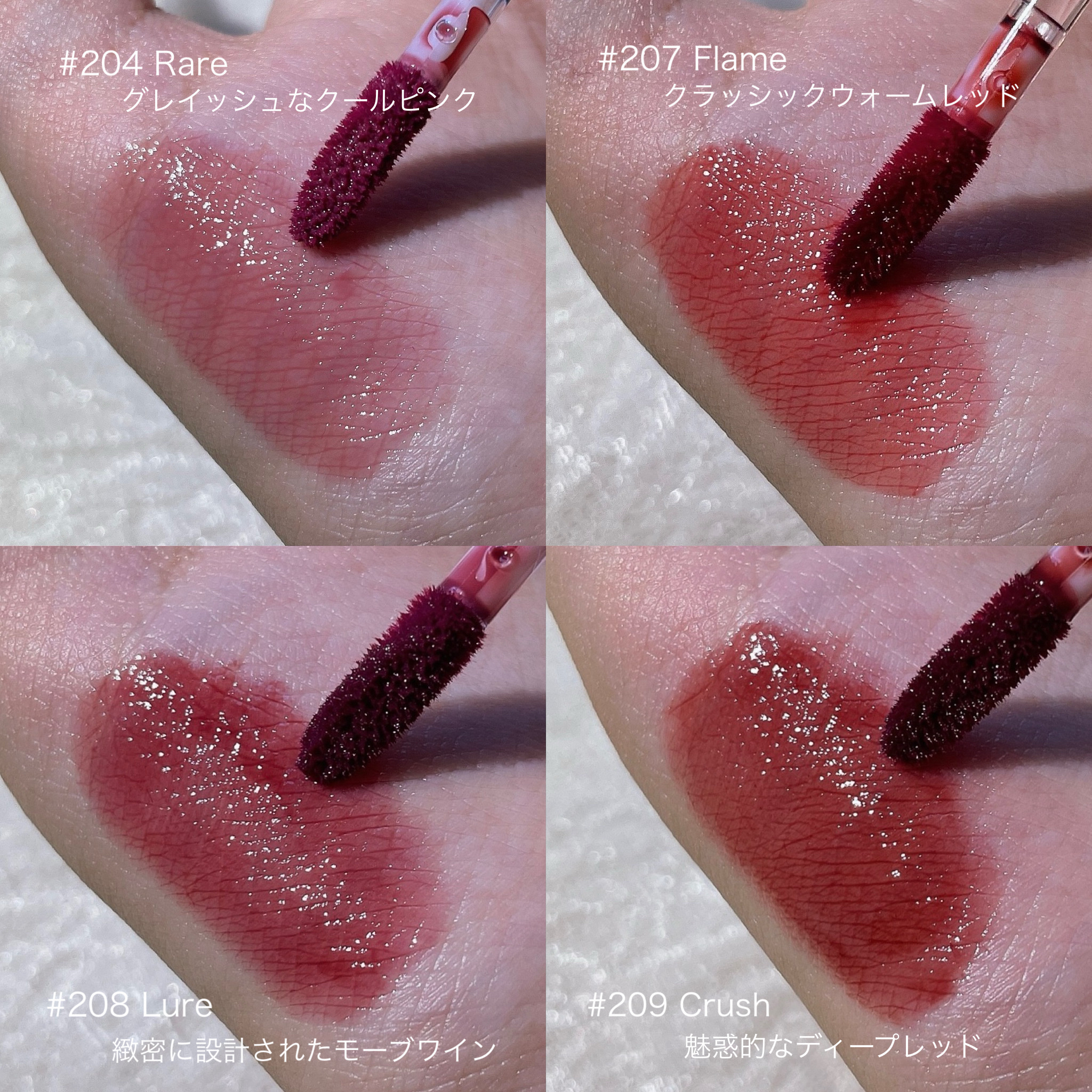 - - 「ティント処方」でつけたての色をキープ。 - まるで露をまとったような水膜ツヤ仕上げ。 - 美容オイル配合でうるおい感が続く。 - 無香料・パラベン不使用・動物由来成分不使用。