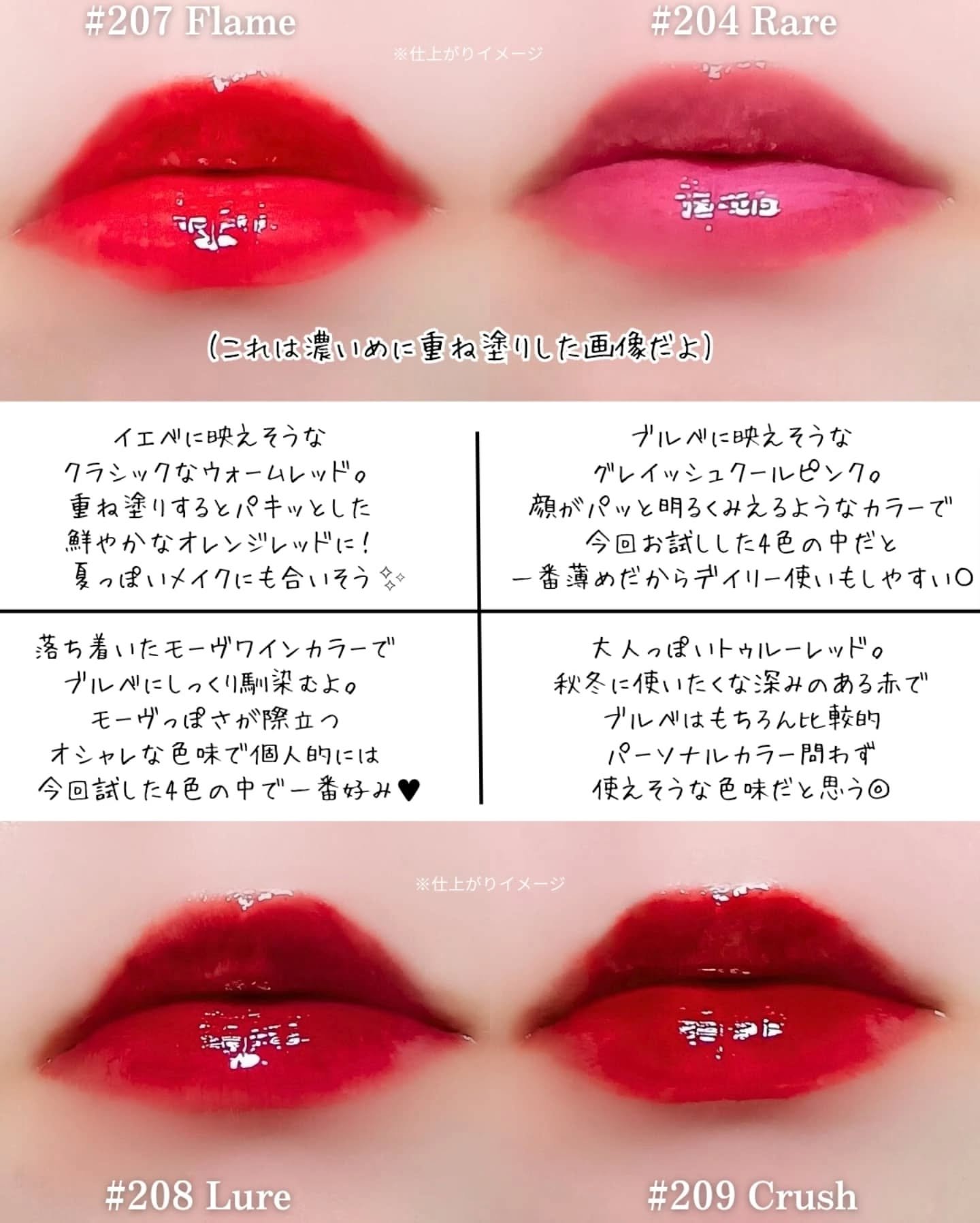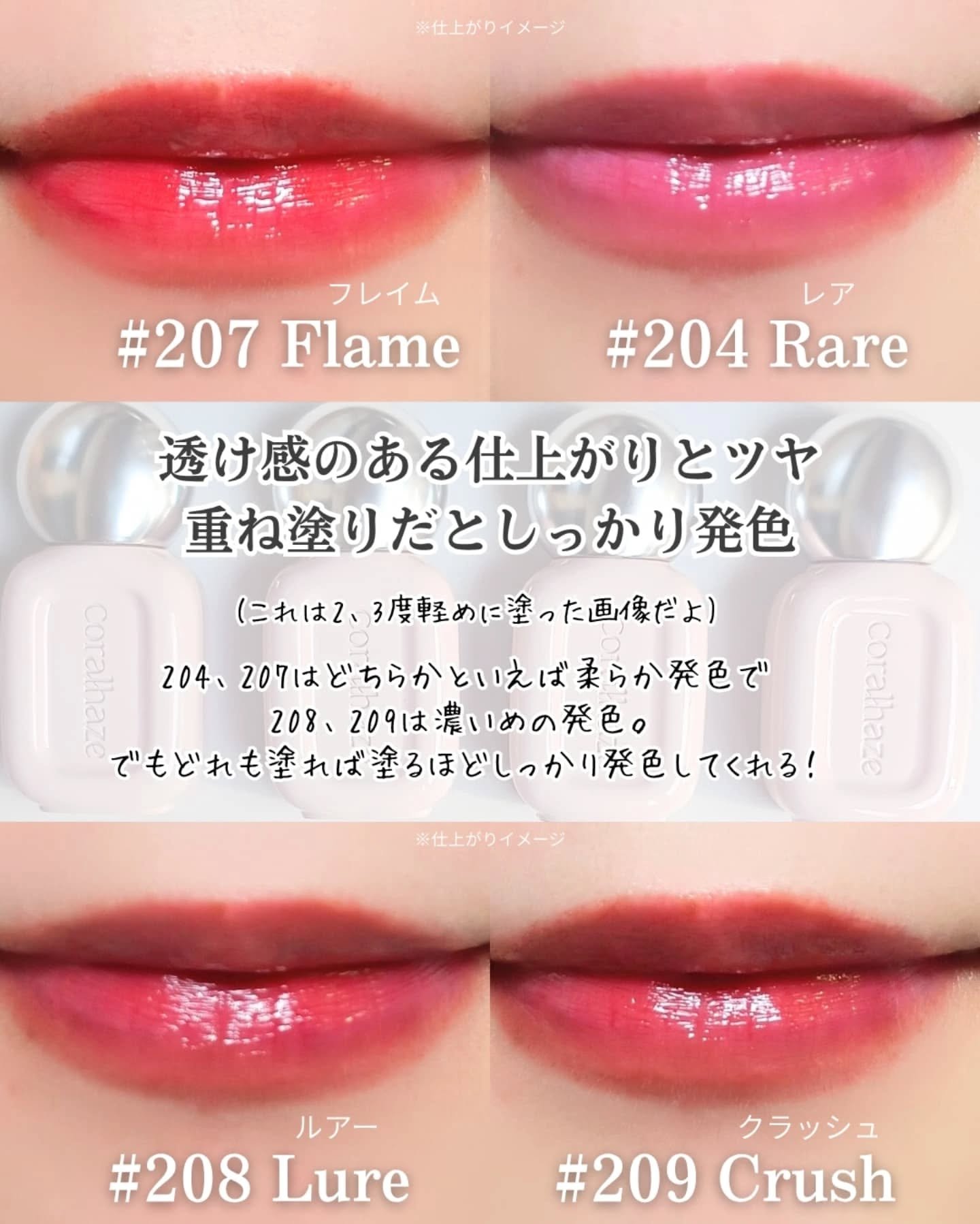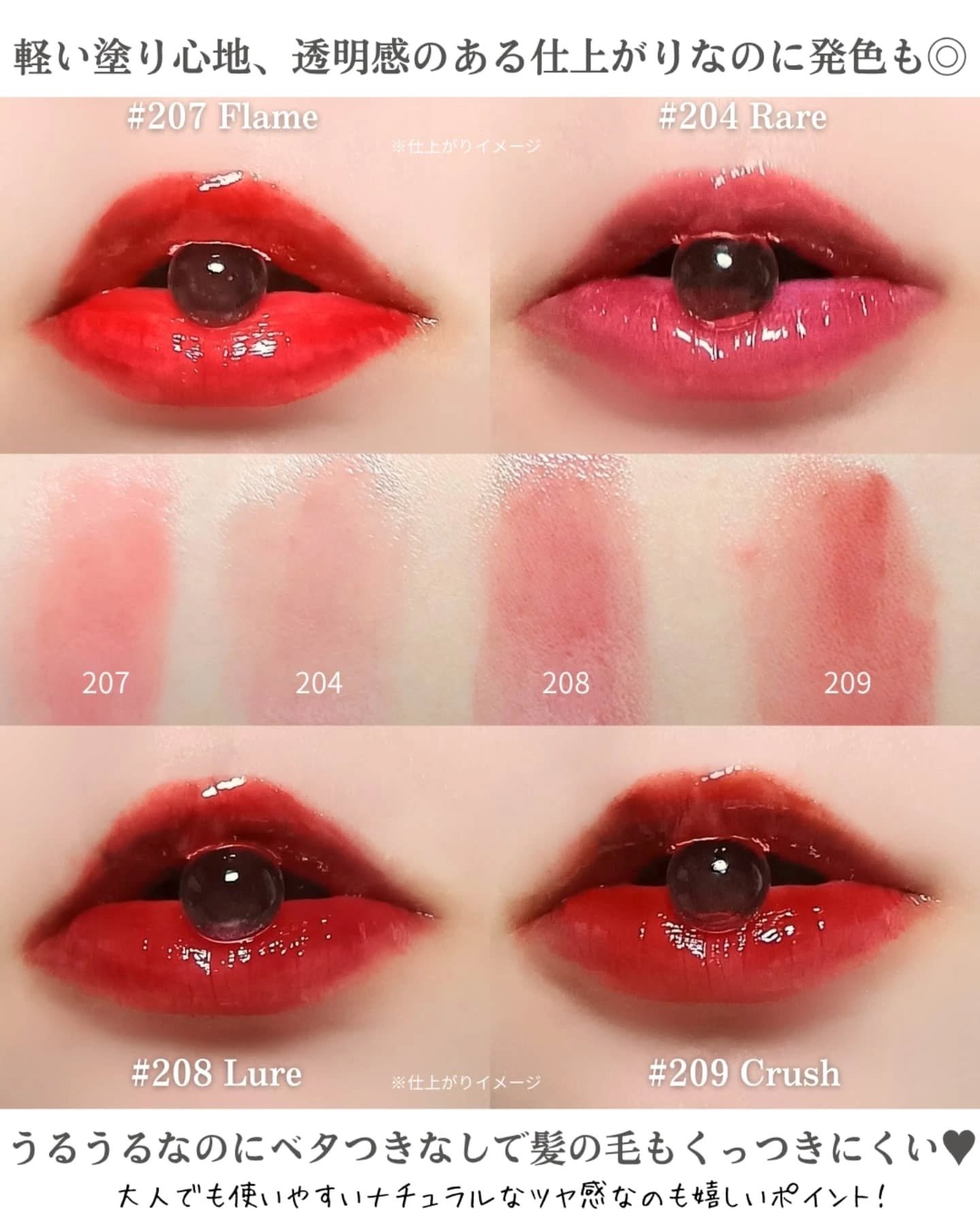 - <201 フェアリー> ダイマージリノール酸ジイソステアリル、ジフェニルシロキシフェニルトリメチコン、ビスジグリセリルポリアシルアジペート-2、水、ジフェニルジメチコン、水添ポリイソブテン、セチルPEG/PPG-10/1ジメチコン、ポリソルベート60、ペンチレングリコール、グリセリン、イソステアリン酸ポリグリセリル-4、フェノキシエタノール、1,2-ヘキサンジオール、セテアレス-20、酸化チタン (CI 77891)、(アクリル酸ヒドロキシエチル/アクリロイルジメチルタウリンNa)コポリマー、ステビオシド、スクワラン、香料、ジラウラミドグルタミドリシンNa、エチルヘキシルグリセリン、エチレンジアミンジコハク酸3Na、赤色227号 (CI 17200)、水酸化Al、黄色5号 (CI 15985)、ポリアクリル酸アンモニウム、イソステアリン酸ソルビタン、黄色4号 (CI 19140)、BG、赤色223号 (CI 45410)、青色1号 (CI 42090)、アラントイン、パンテノール、ツボクサエキス、ヒアルロン酸、加水分解ヒアルロン酸、ヒアルロン酸Na <203 バブリー> ダイマージリノール酸ジイソステアリル、ジフェニルシロキシフェニルトリメチコン、ビスジグリセリルポリアシルアジペート-2、水、ジフェニルジメチコン、水添ポリイソブテン、セチルPEG/PPG-10/1ジメチコン、ポリソルベート60、ペンチレングリコール、グリセリン、イソステアリン酸ポリグリセリル-4、フェノキシエタノール、1,2-ヘキサンジオール、セテアレス-20、(アクリル酸ヒドロキシエチル/アクリロイルジメチルタウリンNa)コポリマー、ステビオシド、酸化チタン (CI 77891)、スクワラン、香料、ジラウラミドグルタミドリシンNa、エチルヘキシルグリセリン、赤色227号 (CI 17200)、エチレンジアミンジコハク酸3Na、黄色5号 (CI 15985)、イソステアリン酸ソルビタン、水酸化Al、ポリアクリル酸アンモニウム、黄色4号 (CI 19140)、BG、青色1号 (CI 42090)、アラントイン、パンテノール、ツボクサエキス、ヒアルロン酸、加水分解ヒアルロン酸、ヒアルロン酸Na <204 レア> ダイマージリノール酸ジイソステアリル、ジフェニルシロキシフェニルトリメチコン、ビスジグリセリルポリアシルアジペート-2、水、ジフェニルジメチコン、水添ポリイソブテン、セチルPEG/PPG-10/1ジメチコン、ポリソルベート60、ペンチレングリコール、グリセリン、イソステアリン酸ポリグリセリル-4、フェノキシエタノール、1,2-ヘキサンジオール、セテアレス-20、(アクリル酸ヒドロキシエチル/アクリロイルジメチルタウリンNa)コポリマー、酸化チタン (CI 77891)、ステビオシド、スクワラン、香料、ジラウラミドグルタミドリシンNa、エチルヘキシルグリセリン、赤色227号 (CI 17200)、黄色5号 (CI 15985)、エチレンジアミンジコハク酸3Na、イソステアリン酸ソルビタン、水酸化Al、ポリアクリル酸アンモニウム、黄色4号 (CI 19140)、青色1号 (CI 42090)、BG、アラントイン、パンテノール、ツボクサエキス、ヒアルロン酸、加水分解ヒアルロン酸、ヒアルロン酸Na <205 ハニーデュー> ダイマージリノール酸ジイソステアリル、ジフェニルシロキシフェニルトリメチコン、ビスジグリセリルポリアシルアジペート-2、水、ジフェニルジメチコン、水添ポリイソブテン、セチルPEG/PPG-10/1ジメチコン、ポリソルベート60、ペンチレングリコール、グリセリン、イソステアリン酸ポリグリセリル-4、フェノキシエタノール、1,2-ヘキサンジオール、セテアレス-20、(アクリル酸ヒドロキシエチル/アクリロイルジメチルタウリンNa)コポリマー、酸化チタン (CI 77891)、ステビオシド、スクワラン、香料、ジラウラミドグルタミドリシンNa、エチルヘキシルグリセリン、赤色227号 (CI 17200)、黄色5号 (CI 15985)、エチレンジアミンジコハク酸3Na、イソステアリン酸ソルビタン、水酸化Al、ポリアクリル酸アンモニウム、黄色4号 (CI 19140)、青色1号 (CI 42090)、BG、アラントイン、パンテノール、ツボクサエキス、ヒアルロン酸、加水分解ヒアルロン酸、ヒアルロン酸Na <206 トフィー> ダイマージリノール酸ジイソステアリル、ジフェニルシロキシフェニルトリメチコン、ビスジグリセリルポリアシルアジペート-2、水、ジフェニルジメチコン、水添ポリイソブテン、セチルPEG/PPG-10/1ジメチコン、ポリソルベート60、ペンチレングリコール、グリセリン、イソステアリン酸ポリグリセリル-4、フェノキシエタノール、1,2-ヘキサンジオール、セテアレス-20、(アクリル酸ヒドロキシエチル/アクリロイルジメチルタウリンNa)コポリマー、ステビオシド、スクワラン、香料、ジラウラミドグルタミドリシンNa、酸化チタン (CI 77891)、エチルヘキシルグリセリン、黄色5号 (CI 15985)、エチレンジアミンジコハク酸3Na、黄色4号 (CI 19140)、赤色227号 (CI 17200)、イソステアリン酸ソルビタン、赤色223号 (CI 45410)、青色1号 (CI 42090)、水酸化Al、ポリアクリル酸アンモニウム、BG、アラントイン、パンテノール、ツボクサエキス、ヒアルロン酸、加水分解ヒアルロン酸、ヒアルロン酸Na <207 フレイム> ダイマージリノール酸ジイソステアリル、ジフェニルシロ
