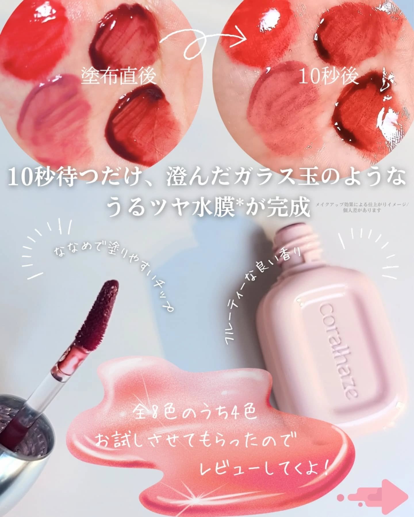 | 中身はゼリーみたいなテクスチャーで ぷるんとしたツヤタイプのティント。 | 詳細を見る | |