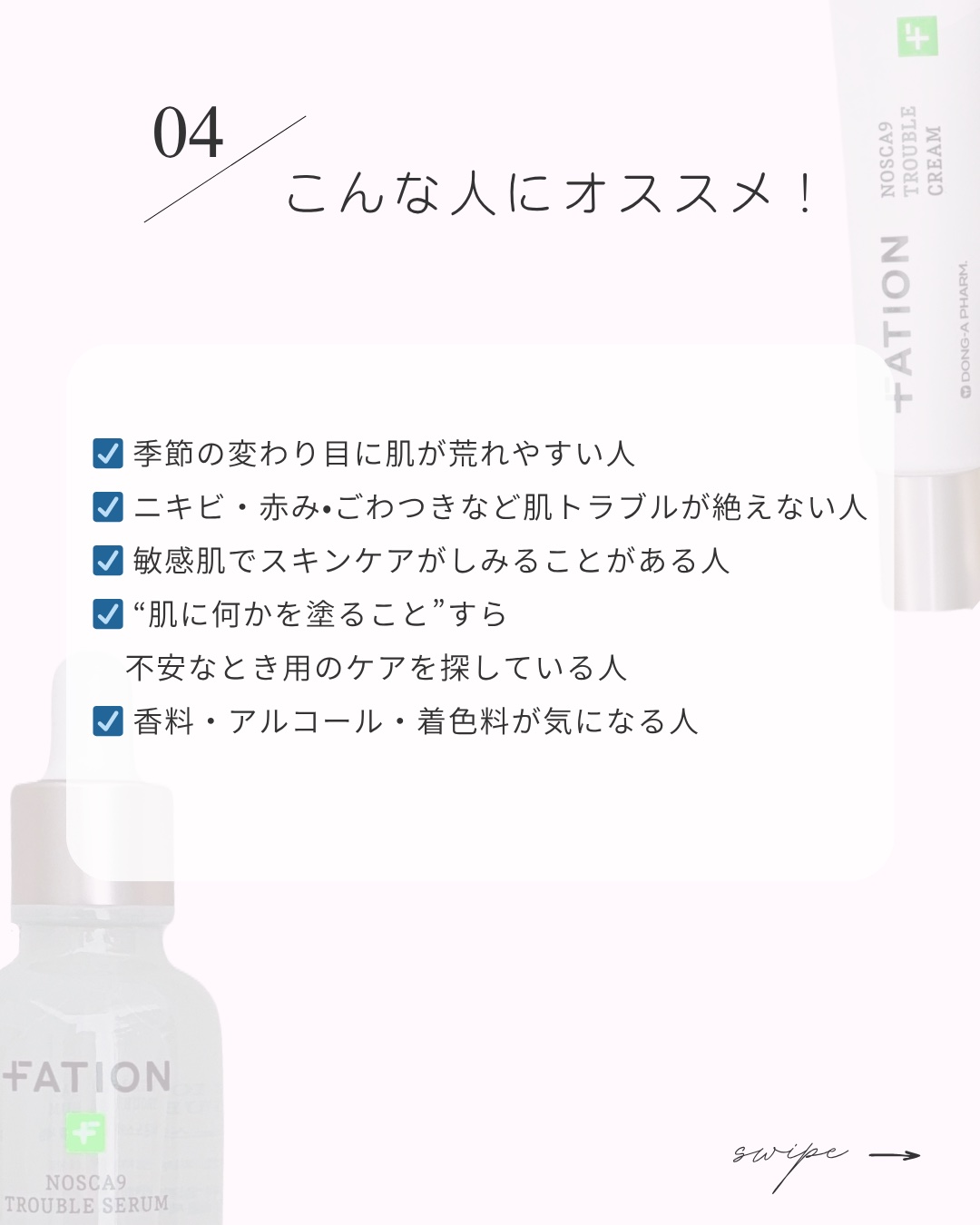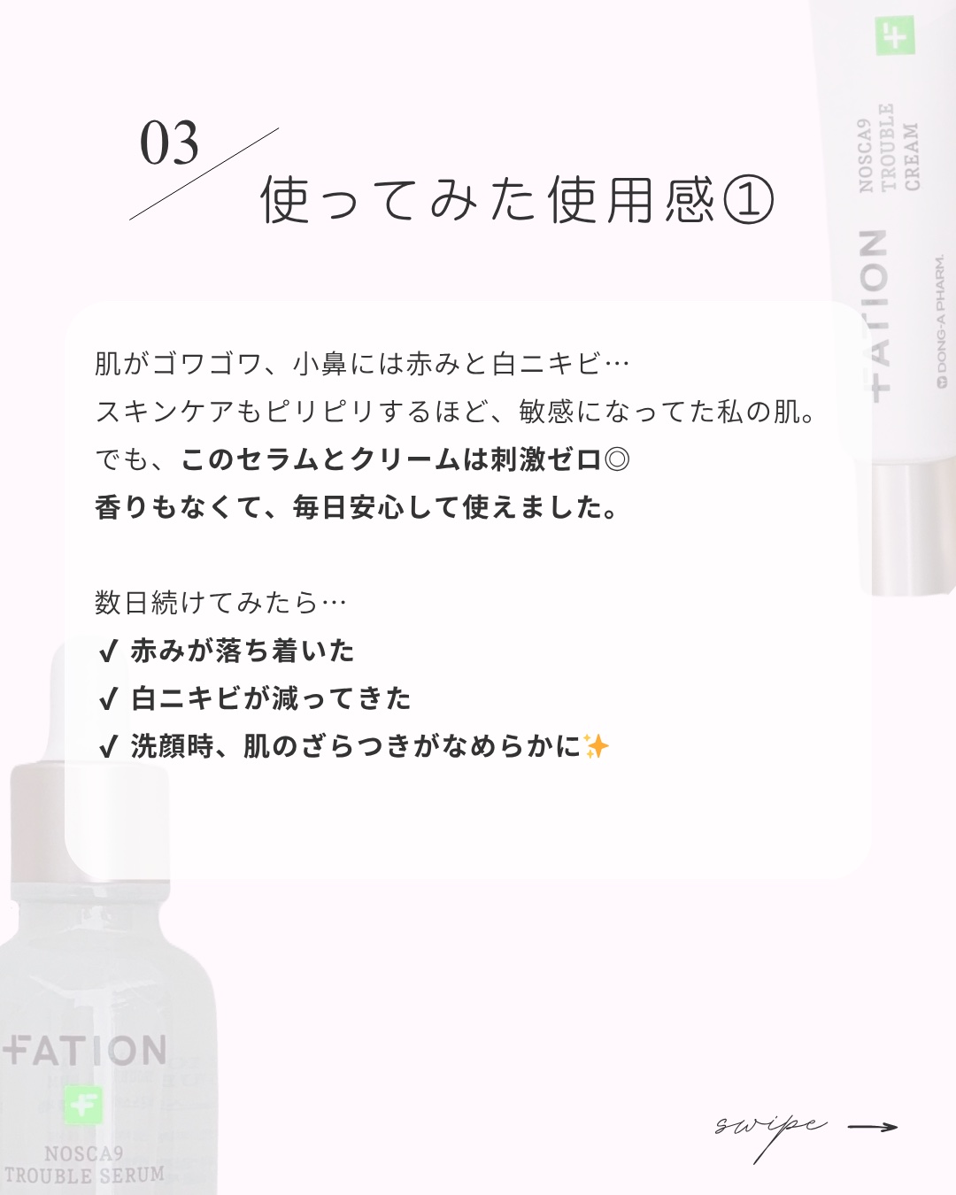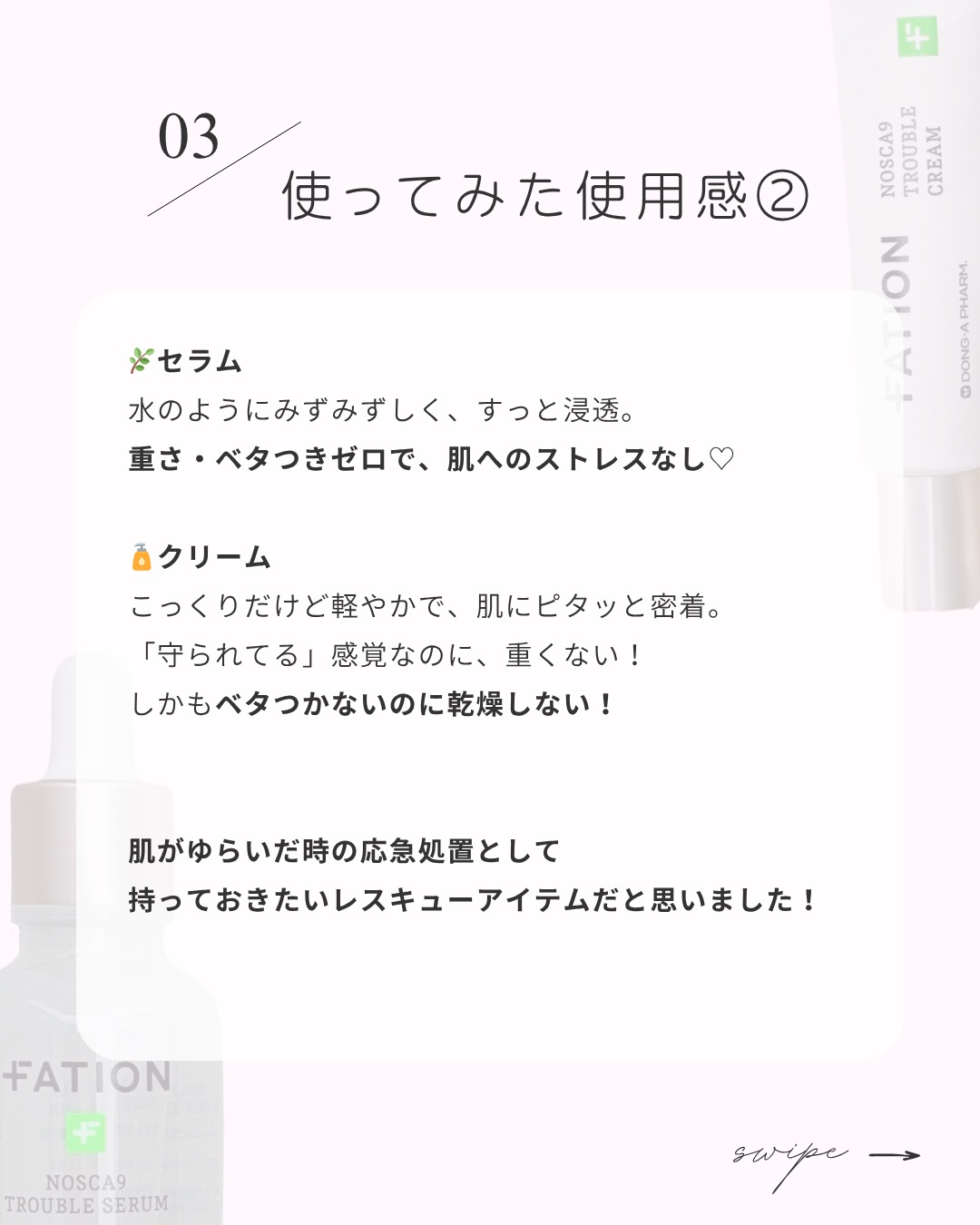 韓国の製薬会社『東亜製薬』で9年間研究開発して作られたノスカナインライン︎︎𓂃🪴 独自開発した有効成分伝達技術【ラピッドサムテクノロジー™】でニキビ、トラブルで敏感になった肌を素早く鎮静させる🍃 ややとろみがあってやさしく肌を包み込んでくれるようなテクスチャーが好き🤲🏻 2度ほど重ね付けするともっちりとした肌に🤍 みずみずしい伸びの良いクリーム🫧 軽くさっぱりしているのにしっかり保湿感がありしっとり肌に🕊 出し口が細いので塗りたいところにピンポイントで塗れるところも良い◎