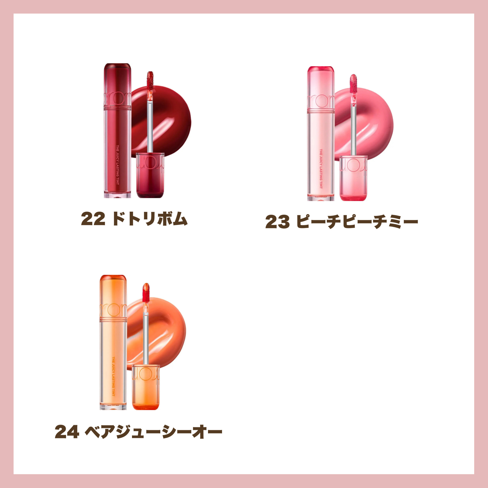【rom&nd】新色で気になる3色購入してみたよ!rom&ndザジューシーラスティングティント26ミスティックピーチブルベ夏さんにおすすめなピーチレッド28スノーストロベリーイエベ春、ブルベ夏さんにおすすめなうるうるピンク30ベアマロンイエべ...