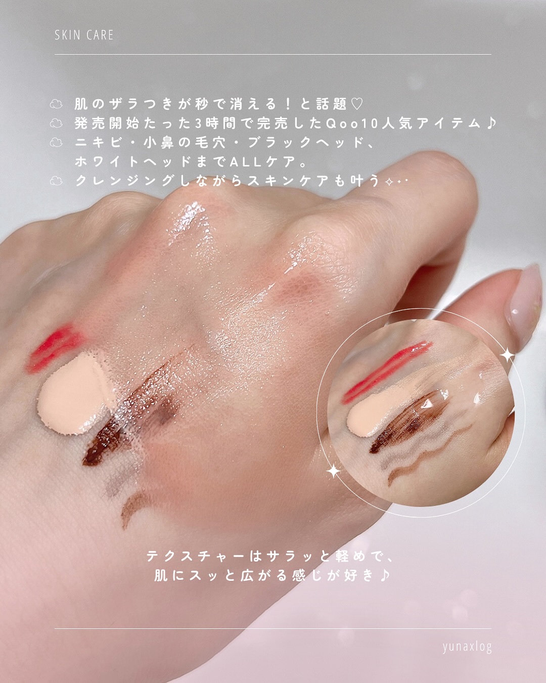 | 少しとろみがあるけど肌に出すとすーっと垂落ちてくるくらいのゆるめのテクスチャーで、のびが良い! | 詳細を見る | |