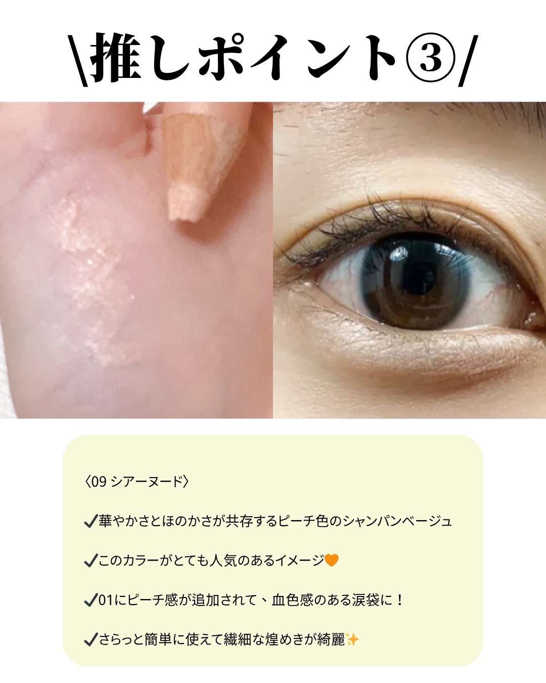 涙袋メーカーとして大人気の #9 シアーヌードというカラー🙌🏻💕 華やかさとほのかさが共存するピーチ色のシャンパンベージュカラー。 すごくなめらかな塗り心地だし、塗ったあと指でもぼかせる👍🏻✨