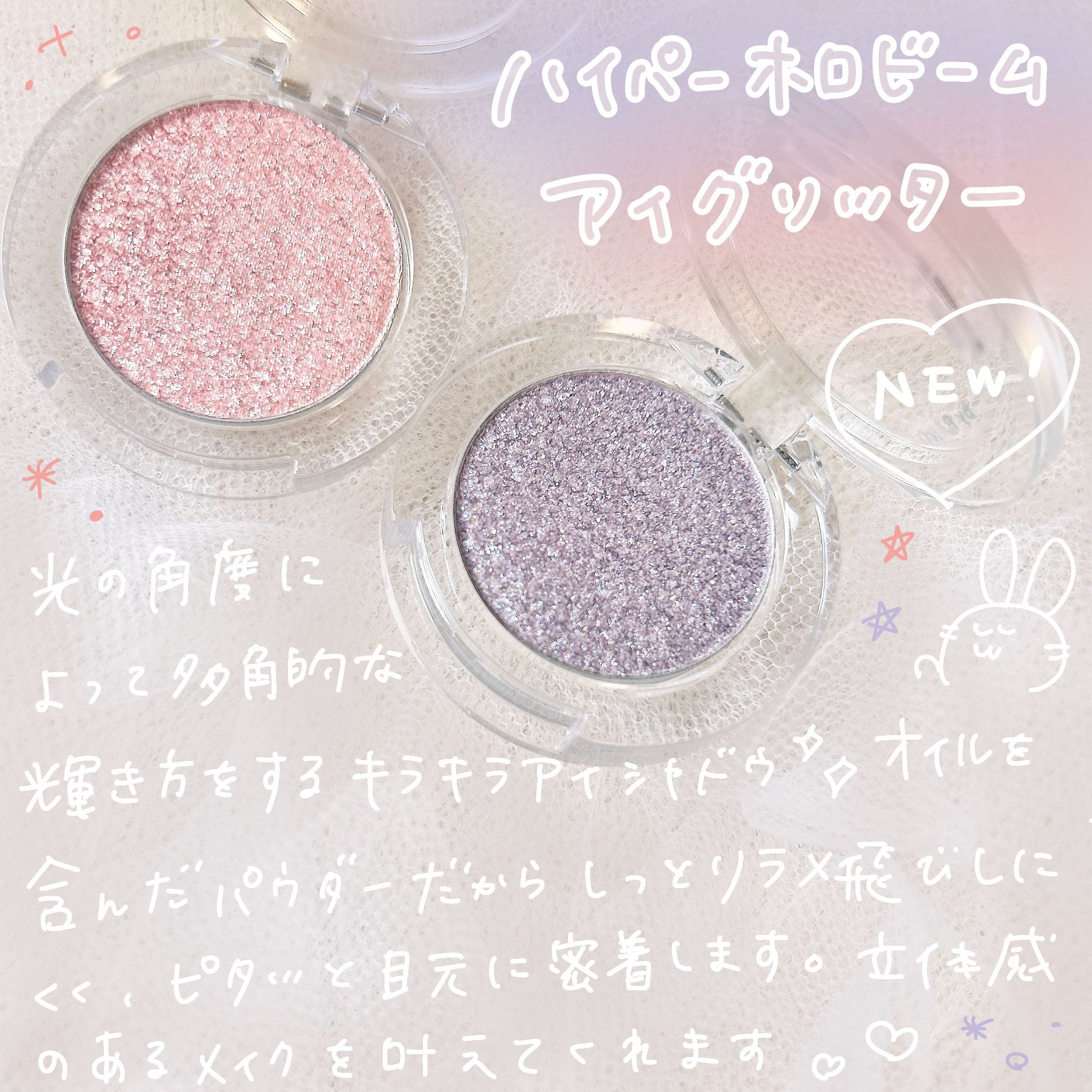 - 触れるだけで溢れ出すきらめき! ホログラフィックグリッターがあらゆる照明下でも立体的に輝き、 多角的に光を反射するプリズム効果! ぴたっと密着力で粉飛びしにくい 長時間持続!