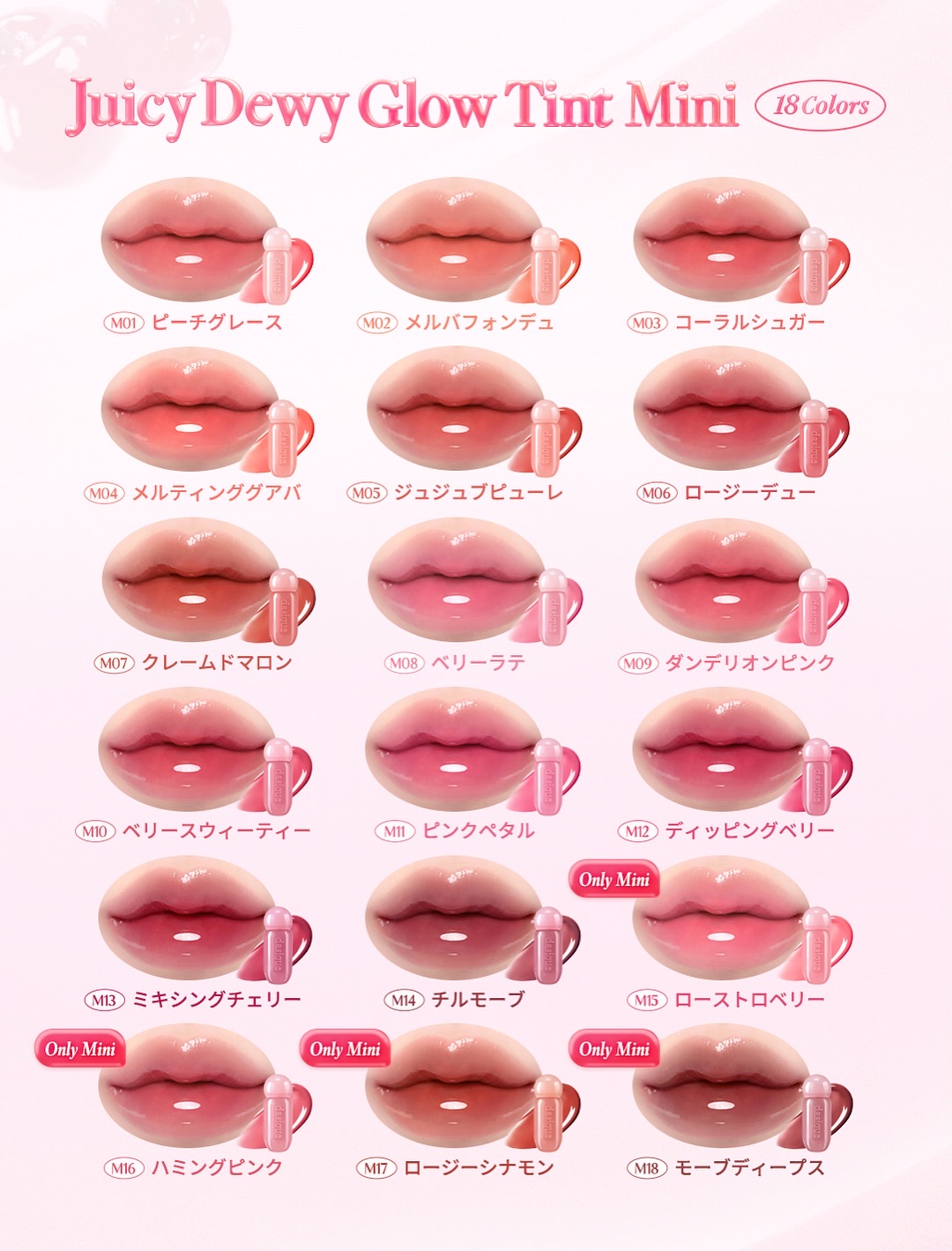 - 【夏新作2カラー登場!】 まるで果実のしずくがそのままリップになったような、みずみずしさと繊細なツヤを詰め込んだ「ジュージーデューイグロウティント」 夏新作で登場する新色「ベリーハート」、「タロミルク」は、透明感とふんわりとした色づきを徹底的にこだわって、何度もテストを重ねて生まれた特別なクールトーンカラー。 ひと塗りで唇をうるおし、重ねても重くならず、果実たっぷり!光をまとうような仕上がりに! - 蜂蜜に漬けた果物のように、うるちゅるふっくらとした果汁粘膜「ジューシーデュイグロウティント」 ミニだけの限定4色 15 ローストロベリー 16 ハミングピンク 17 ロージーシナモン 18 モーブディープス ♡唇に触れた途端、ぷるんと色っぽい果汁コーティング 果汁コーティングがじゅわっと唇に広がり、透明に輝くうるちゅる感を!蜂蜜に漬けた果物のようにぷるんぷるんとした唇を演出するグロウティント ♡イエベ、ブルべに合わせた多彩なカラーバリエーション 14色のカラーバリエーションで単独または、2色レイヤーリングして様々なリップメイクを演出 ♡ティント+リップグロスを一気に塗る効果! ティントの鮮やかな発色とリップグロスのうるうる透明ツヤ感が何度塗り重ねてもべたつかせず、唇にピタッと密着! 2025年11月1日(土)より、Qoo10公式ショップおよび東京フラッグシップストアにて発売予定
