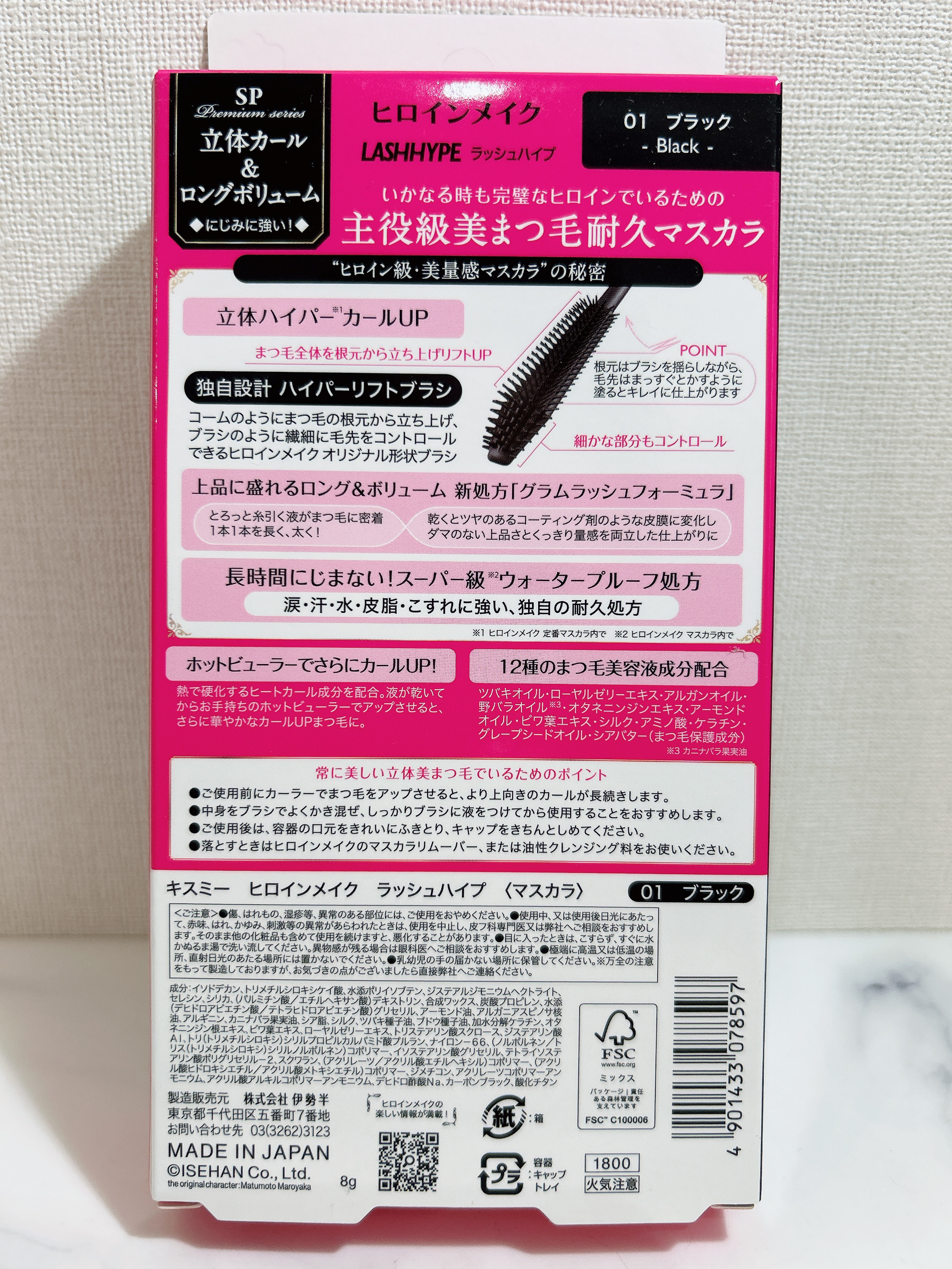 - ■根元からリフト&カール!指先越え、ハイパーリフトブラシ! 独自設計の「ハイパーリフトブラシ」を採用。 コームのようにまつ毛の根元を立ち上げ、ブラシのように繊細に毛先をコントロール。 指先感覚でキワまで使える先端の角度がポイント! 先端の角度は12°。 まぶたに液がつきにくく、目頭や目尻の細かい部分もコントロールしながら使いやすいように、何度も試作を重ねてたどり着いた数値です。 ■上品に盛れるロング&ボリューム!新処方「グラムラッシュフォーミュラ」 ■長時間にじまない!スーパー級※ウォータープルーフ処方 涙・汗・水・皮脂・こすれに強い、独自の耐久処方。24時間カールキープ データ取得済み。 ※ヒロインメイクマスカラ内で ■12種のまつ毛美容液成分配合 ツバキオイル・ローヤルゼリーエキス・アルガンオイル・野バラオイル(カニナバラ果実油)・オタネニンジンエキス・アーモンドオイル・ビワ葉エキス・シルク・アミノ酸・ケラチン・グレープシードオイル・シアバター(まつ毛保護成分) ■ホットビューラーでさらにカールUP! 熱で硬化するヒートカール成分配合。液が乾いてからお手持ちのホットビューラーでアップさせると、さらに華やかなカールUPまつ毛に仕上がります。