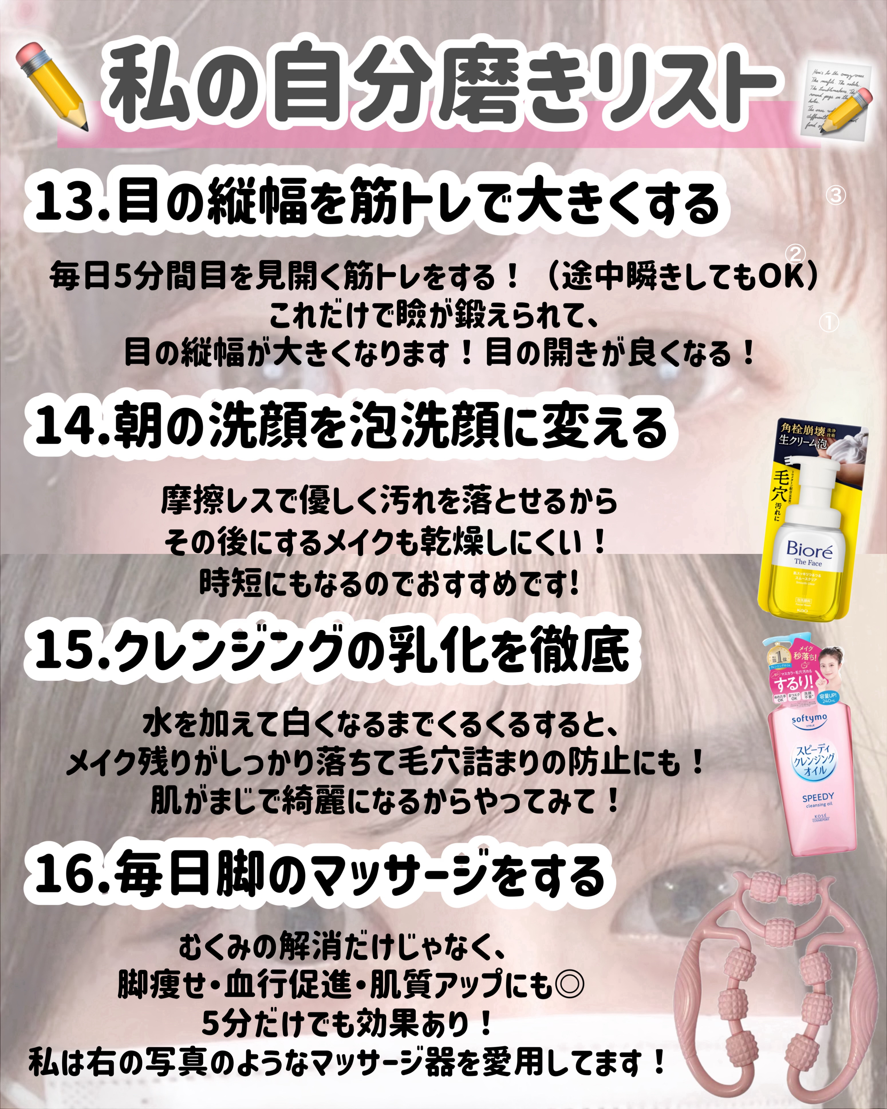 【瞼の筋トレ】について詳しく解説!!これさえすれば絶対変われます!!!瞼の筋トレって?という方は、画像をご覧下さい‼️これがないと私は今頃二重になってなかった…と言っても過言ではないくらい、私の癖付けには欠かせなかったものです!!今回は、昔からしている筋トレ1つと、最近思いついて実践している筋トレ2つをご紹介します!!どれもすごく簡単なので、ぜひ試してみてください📷Q 一日どのくらいしてた?A とにかく暇さえあればしていました!!1日30分の日もあれば、何時間もする日もありましたこの筋トレは、お風呂に入りながらや勉強しながら、スマホ見ながらでもできるのがいいところなので、スキマ時間を上手く活用するのがいいかな思います💭Q 今まで何回くらい筋肉痛になった?A 左右どちらも5回くらいだと思います!瞼が私より軽い方は、1、2回で十分スッキリすると思いますよ❣️Q どれくらいで筋肉痛になった?A 筋肉痛までは平均して2週間くらいかかりました!でもフォロワーさんの中には1日でなられた方も多くいらっしゃいますなのでその人の瞼や頑張り次第だと思います❣️Q 筋トレ1