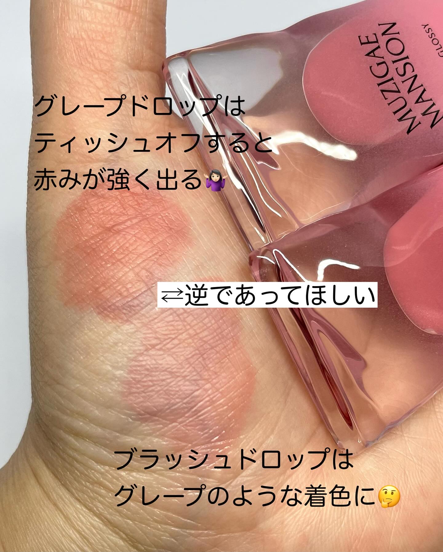 MUZIGAEMANSION⟡.·OBJECTGLOSSYMini⟡.·006GrapeDrop▶︎青みのあるモーブピンク007BlushDrop▶︎ニュートラル寄りの粘膜ピンクモーブデュオセットで購入しましたが、くすみも控えめで誰でも似合う...