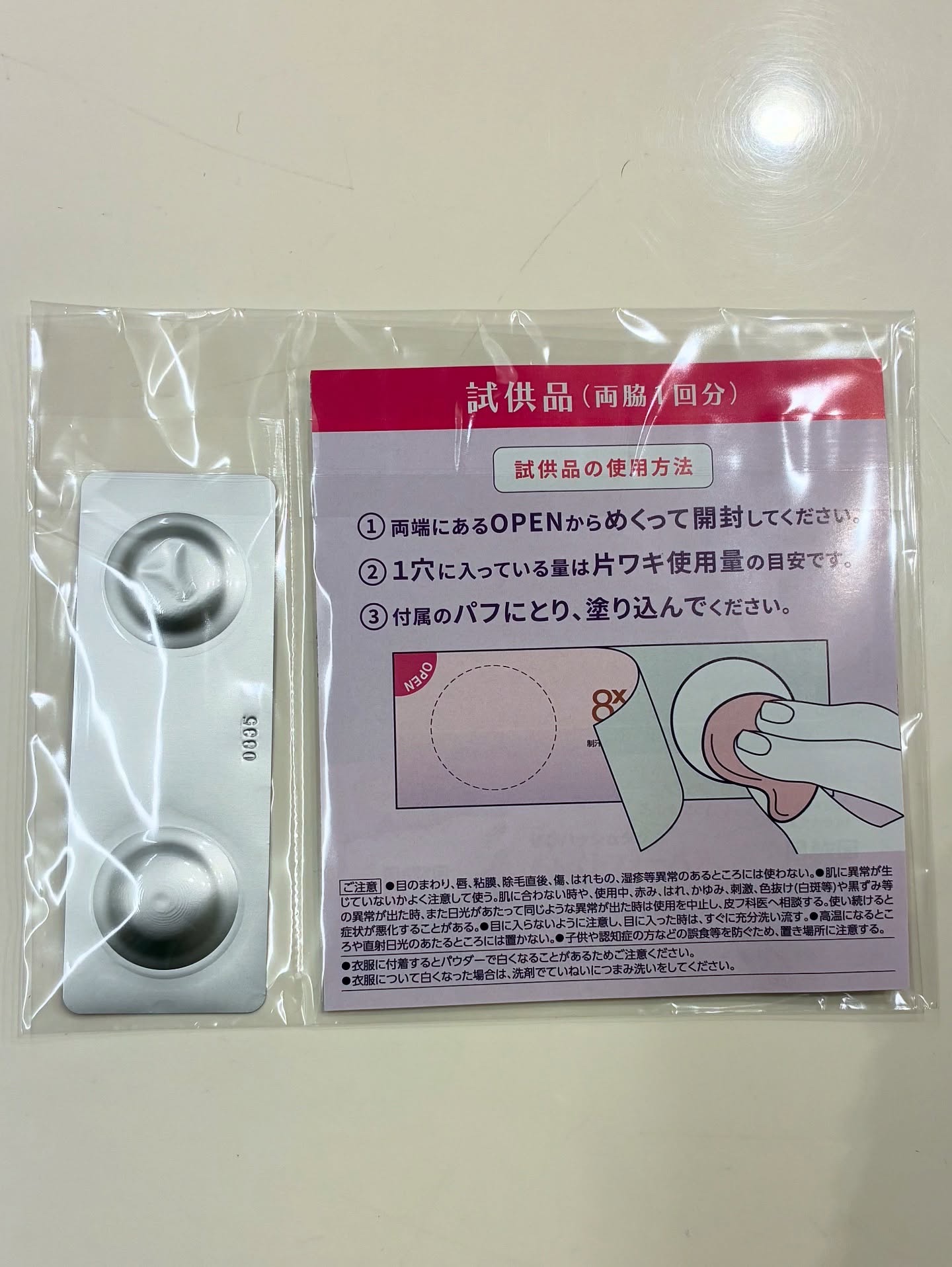 - 【医薬部外品】 パフで塗り込む制汗パテ 一日ずっと汗・ニオイを防ぐ ●パフで毛穴まで塗り込む制汗パテ ●クッションパフ+柔らかパテで毛穴まで入り込んでピタッと密着 ●するっ!としたら塗り込めたサイン! ●汗のニオイの元となるニオイ菌を殺菌して1日ずっと汗・ニオわせない。 ●汗が気になる時でも1日ずっとさらさら*1持続 ・制汗成分:焼ミョウバン*2配合 ・殺菌成分:イソプロピルメチルフェノール配合 ・高吸汗・高吸湿ドライパウダー配合(基剤) ○無香性 ○両脇塗布で約100回分(使用量の目安:片わき直径1.4cm) ○パフ1枚入り *1 高吸汗・高吸湿ドライパウダー(基剤)配合 *2 乾燥硫酸アルミニウムカリウム 効能効果:わきが(腋臭)、皮ふ汗臭、制汗