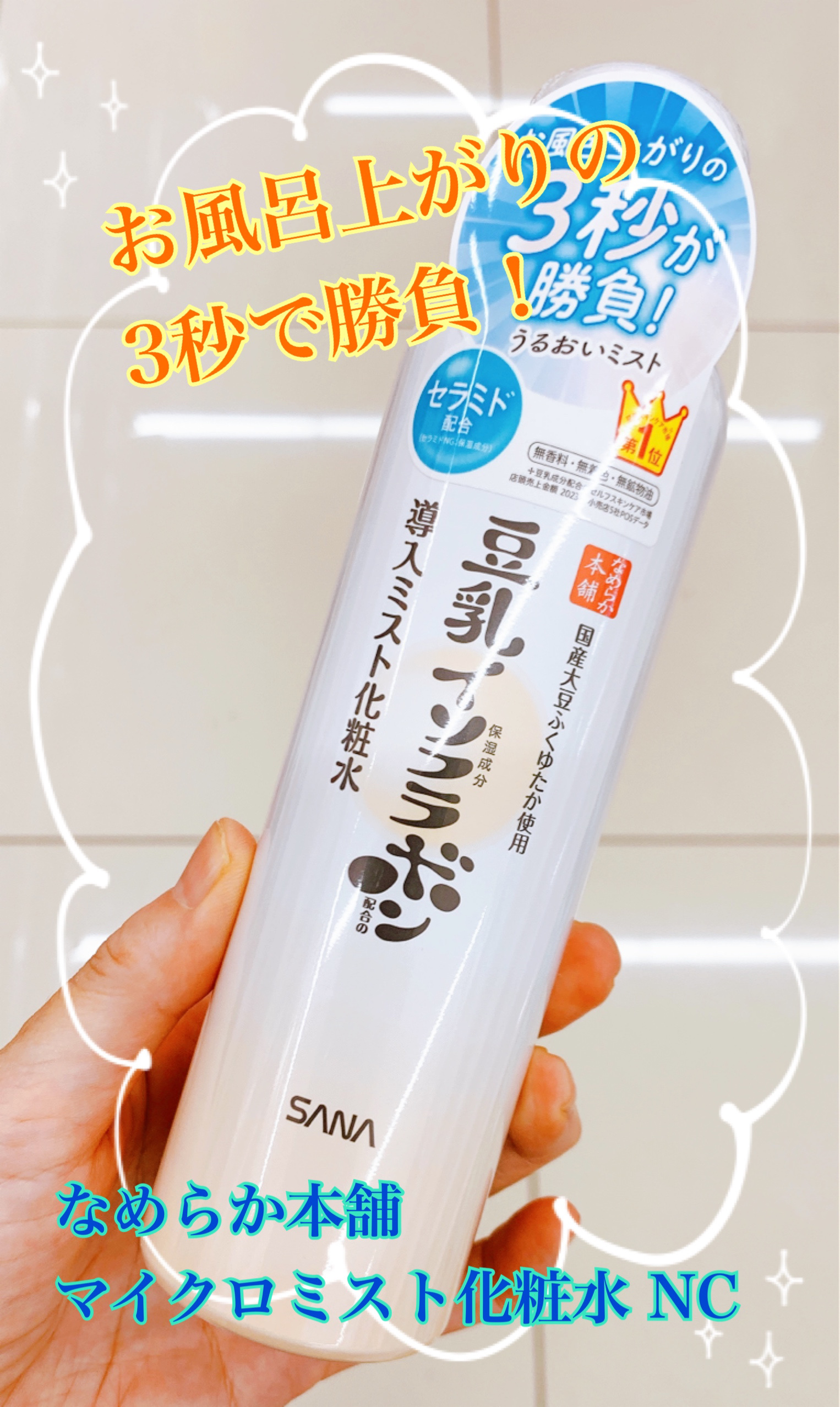 お風呂上がり3秒で保湿できるスプレー化粧水✨ 細かなミストが気持ちよく使えて、お風呂上がりすぐスキンケアできなくての突っ張り感も感じなくなるし、その後のスキンケアの導入化粧水にもなってくれる👏 毛穴より細かく、肌あたりの良いマイクロミストが角層まで浸透し、うるおいのあるお肌に導く😊 九州産大豆「ふくゆたか」から作られた高純度豆乳イソフラボンと豆乳発酵液、さらにヒト型セラミド配合🙌