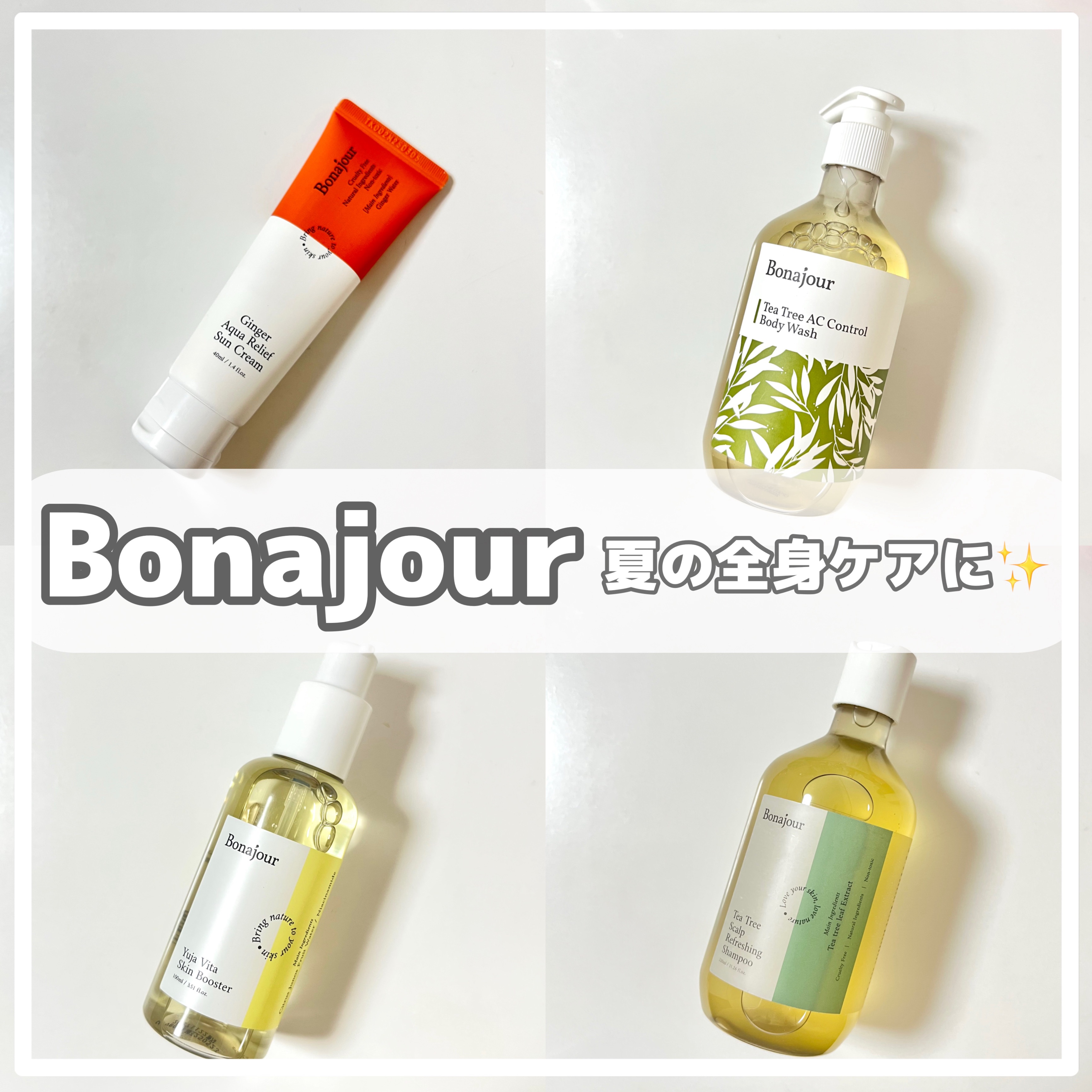 #PRBonajour(ボナジュール)・ゆずビタスキンブースター・ジンジャーアクアリリーフサンクリームゆずビタスキンブースターはゆず水をたっぷり使用したブースターくすみ・乾燥・肌荒れバランスよくアプローチしてくれて、さっぱりと軽い付け心地なが...