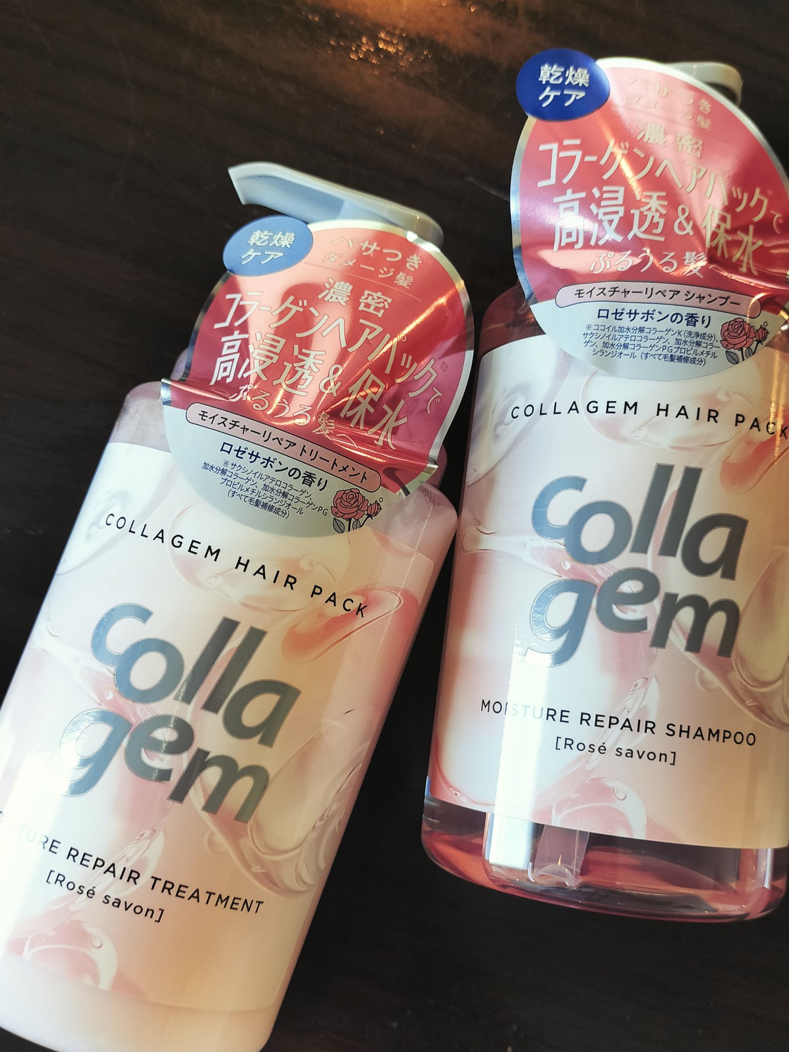 - 洗うだけで、濃密コラーゲンヘアパック※1,4,5,6 「コラジェム モイスチャーリペアシャンプー&トリートメント」 コラーゲン由来の洗浄成分※1配合(※シャンプーのみ) 乾燥・パサつく髪に【高浸透&保水】 まとまる、ぷるうる髪へ ◎リッチハイドレーション処方 【髪内部の崩れた保水の構造※2を補修】 パサついて硬くなった髪をなめらかに ➀スクワラン※3 髪内部に浸透し、潤いとしなやかさを与える ➁モイスチャーオイル※4 髪を補修・保護し、なめらかな手触りに 【コラーゲン美容補修成分※5,6】 ➀デュアルリペアコラーゲン※5 大きさが違う2つのコラーゲンが 内部と外部から潤い浸透、洗うたび補修 ➁ヒートケアコラーゲンMIX※6,7 熱を味方にしてアイロンなどの熱ダメージから キューティクルを補修・保護 「ほんのり甘く透明感のある ロゼサボンの香り で癒しのバスタイムに」 ※1 ココイル加水分解コラーゲンK(洗浄成分) ※2 毛髪の水分と油分のバランスのこと ※3 エモリエント成分 ※4 マカデミア種子油、ヒマワリ種子油(すべてエモリエント成分) ※5 サクシノイルアテロコラーゲン、加水分解コラーゲン(すべて毛髪補修成分) ※6 加水分解コラーゲンPGプロピルメチルシランジオール(毛髪補修成分) ※7 グルコシルヘスペリジン(保湿成分)