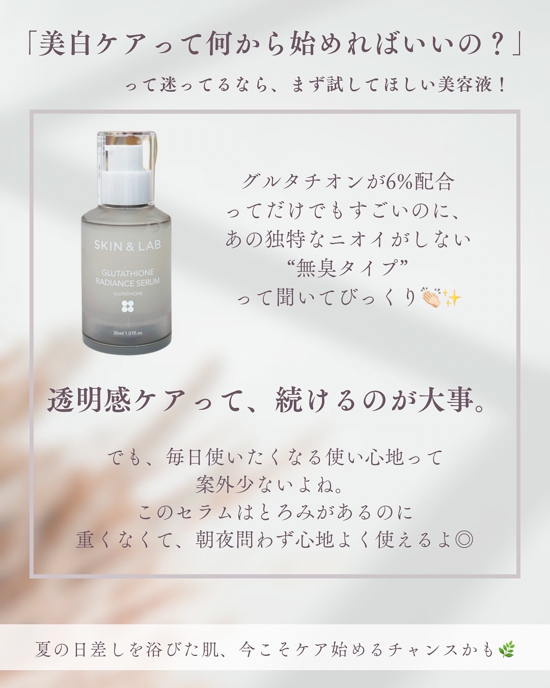 【#PR】SKIN&LABグルタチオンラディアンスセラム美白や抗酸化作用のあるグルタチオンが6%も高濃度配合された美容液が新発売されました☘️グルタチオンは独特なニオイが気になる成分なのですがSKIN&LABは無臭処方に成功したそうです🥹💕ま...