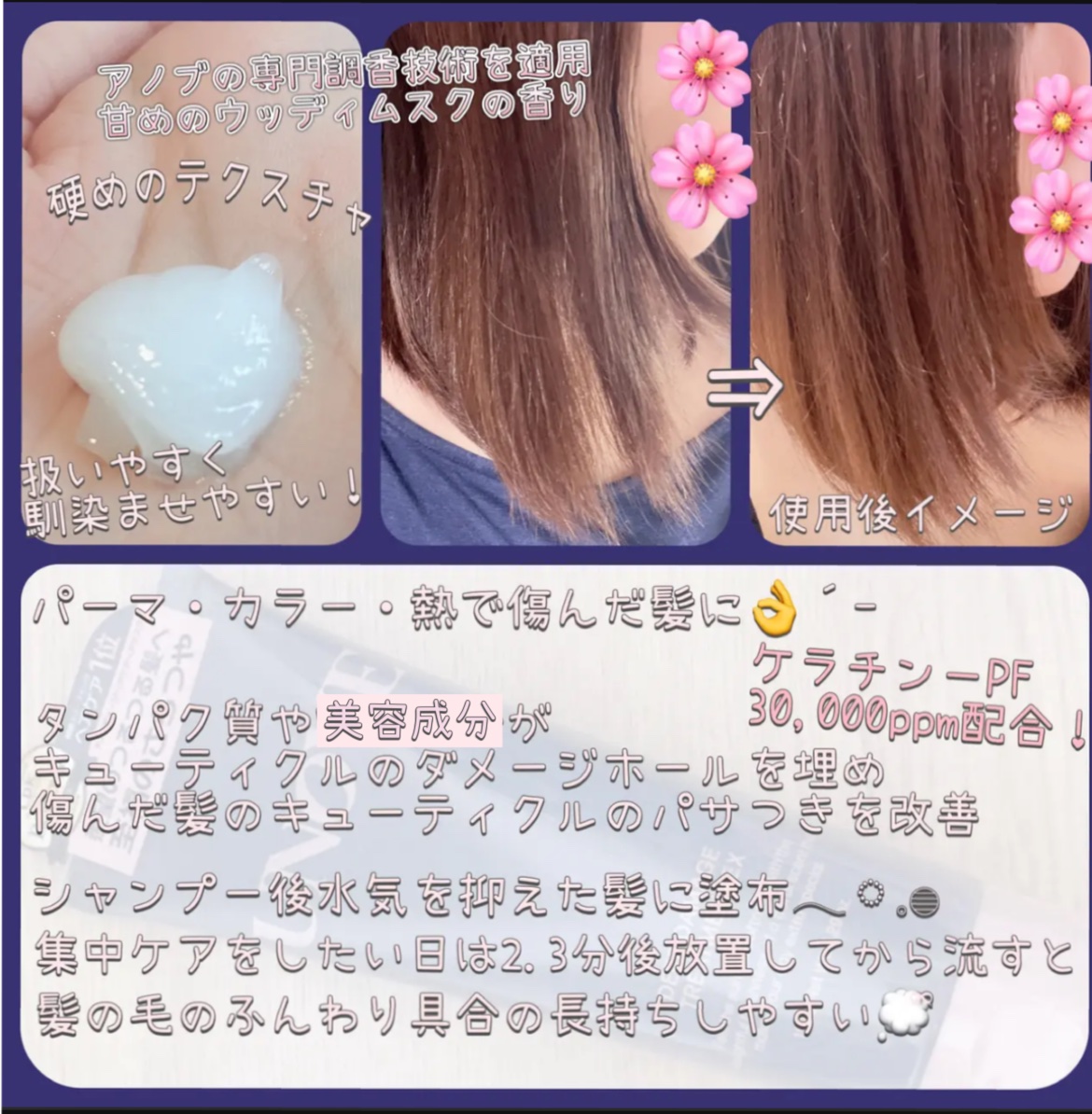 - <テンダーブルーム(フレッシュフローラルムスク)> 水、グリセリン、ジメチコン、セタノール、ベヘントリモニウムクロリド、BG、セテアリルアルコール、DPG、ベヘニルアルコール、香料、ベヘントリモニウムメトサルフェート、アモジメチコン、イソプロパノール、ソルビトール、トレハロース、ステアラミドプロピルジメチルアミン、ステアルトリモニウムクロリド、カプリリルグリコール、乳酸、ステアリルアルコール、アラキジルアルコール、酢酸トコフェロール、PG、ヘキシルシンナマル、クエン酸、トリデセス-3、トリデセス-15、セトリモニウムクロリド、ゲラニオール、シトロネロール、リモネン、フェノキシエタノール、加水分解ケラチン、エタノール、加水分解コラーゲン、酢酸、加水分解シルク、1,2-ヘキサンジオール、加水分解ダイズタンパク、加水分解トウモロコシタンパク、加水分解アボカドタンパク、カラスムギタンパクエキス、シルクアミノ酸、エチルヘキサンジオール、オリーブ果実油、マカデミア種子油、ヒマワリ種子油、システイン、ツバキ種子油、アルガニアスピノサ核油、ロイシン、バリン、タウリン、イソロイシン、アスパラギン酸、オルニチン、グルタミン酸、チロシン、トリプトファン、トレオニン、セリン、プロリン、フェニルアラニン、メチオニン、リシン、ヒスチジン、グリシン、グルタミン、シスチン、アスパラギン、アルギニン、アラニン <アノブ ディープダメージトリートメントEX テンダ―ブルームの香り> 水、ベヘニルアルコール、BG、グリセリン、ジメチコン、ソルビトール、フェノキシエタノール、香料、エタノール、PG、オリーブ果実油、アスパラギン酸、アルギニン、グリシン、セリン、アラニン、プロリン、バリン、イソロイシン、トレオニン、ヒスチジン、フェニルアラニン、カプリリルグリコール、セタノール、DPG、セテアリルアルコール、乳酸、ツバキ種子油、マカデミア種子油、加水分解コラーゲン、トレハロース、クエン酸、イソプロパノール、ステアリルアルコール、セトリモニウムクロリド、加水分解シルク、ベヘントリモニウムクロリド、酢酸トコフェロール、アルガニアスピノサ核油、アラキジルアルコール、1,2-ヘキサンジオール、ヒマワリ種子油、グルタミン酸、リシン、ロイシン、チロシン、タウリン、システイン、トリプトファン、加水分解ダイズタンパク、ステアラミドプロピルジメチルアミン、加水分解ケラチン、リモネン、シトロネロール、ゲラニオール、ステアルトリモニウムクロリド、エチルヘキサンジオール、メチオニン、グルタミン、酢酸、ヘキシルシンナマル、シルクアミノ酸、オルニチン、シスチン、アスパラギン、アモジメチコン、加水分解アボカドタンパク、ベヘントリモニウムメトサルフェート、カラスムギタンパクエキス、加水分解トウモロコシタンパク、トリデセス-3、トリデセス-15 <ウォームペタル> 水、ベヘニルアルコール、BG、グリセリン、ジメチコン、ソルビトール、フェノキシエタノール、香料、エタノール、PG、オリーブ果実油、アスパラギン酸、アルギニン、グリシン、セリン、アラニン、プロリン、バリン、イソロイシン、トレオニン、ヒスチジン、フェニルアラニン、カプリリルグリコール、セタノール、DPG、セテアリルアルコール、乳酸、ツバキ種子油、マカデミア種子油、加水分解コラーゲン、トレハロース、クエン酸、イソプロパノール、ステアリルアルコール、セトリモニウムクロリド、加水分解シルク、ベヘントリモニウムクロリド、酢酸トコフェロール、アルガニアスピノサ核油、アラキジルアルコール、1,2-ヘキサンジオール、ヒマワリ種子油、グルタミン酸、リシン、ロイシン、チロシン、タウリン、システイン、トリプトファン、加水分解ダイズタンパク、ステアラミドプロピルジメチルアミン、加水分解ケラチン、リモネン、シトロネロール、ゲラニオール、ステアルトリモニウムクロリド、エチルヘキサンジオール、メチオニン、グルタミン、酢酸、ヘキシルシンナマル、シルクアミノ酸、オルニチン、シスチン、アスパラギン、アモジメチコン、加水分解アボカドタンパク、ベヘントリモニウムメトサルフェート、カラスムギタンパクエキス、加水分解トウモロコシタンパク、トリデセス-3、トリデセス-15